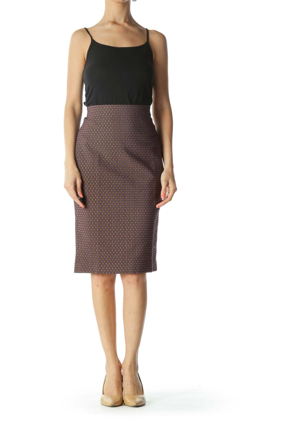Purple/Gold/Black Textured-Geometric-Pattern Pencil Skirt with Slit and Elastic-Waist-Band