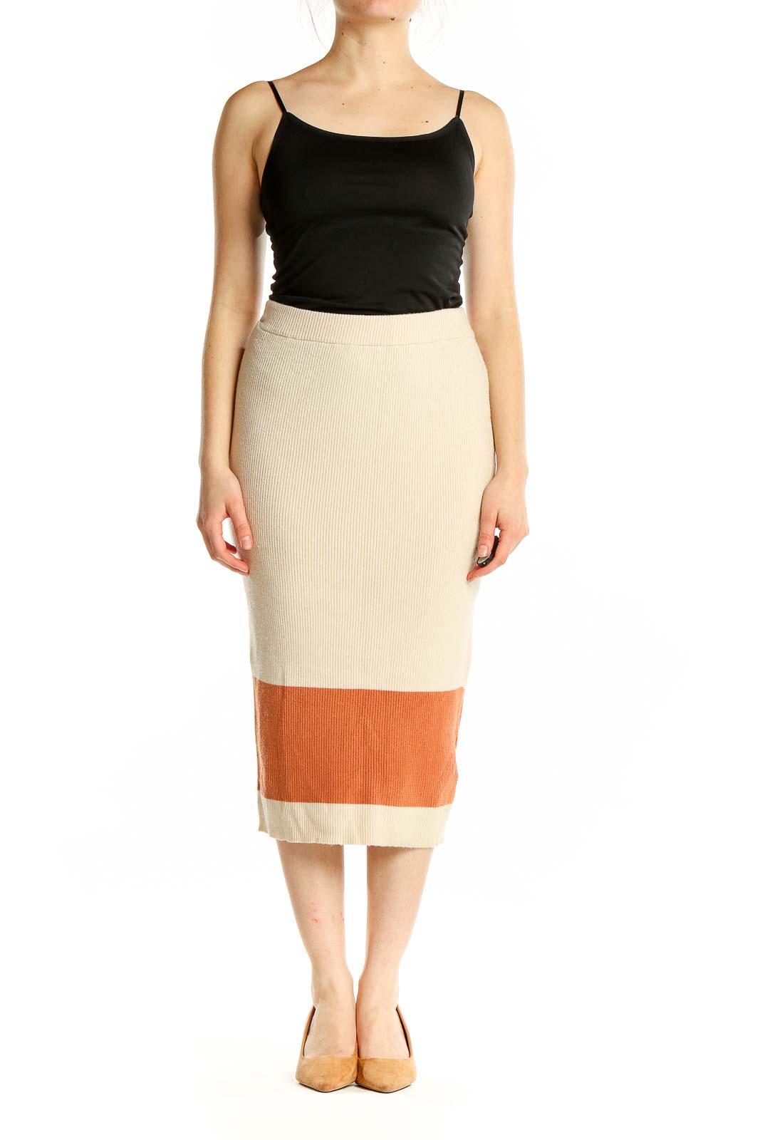 Crafted from a blend of nylon, polyamide, polyester, and viscose, this skirt offers durability and easy care. The color-block design with a striking orange band at the bottom adds a modern twist to the classic midi skirt. Its pull-on style ensures effortless dressing, while the elastic waistband provides a comfortable fit.