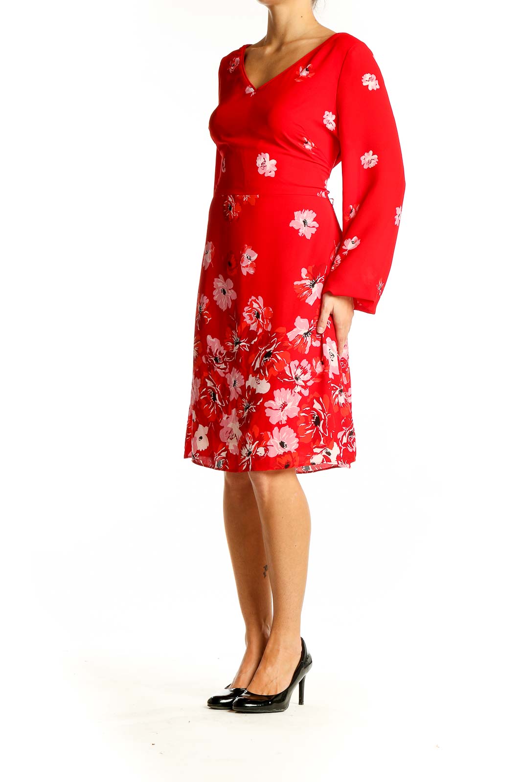 Front view of red floral long sleeve V-neck dress from White House Black Market