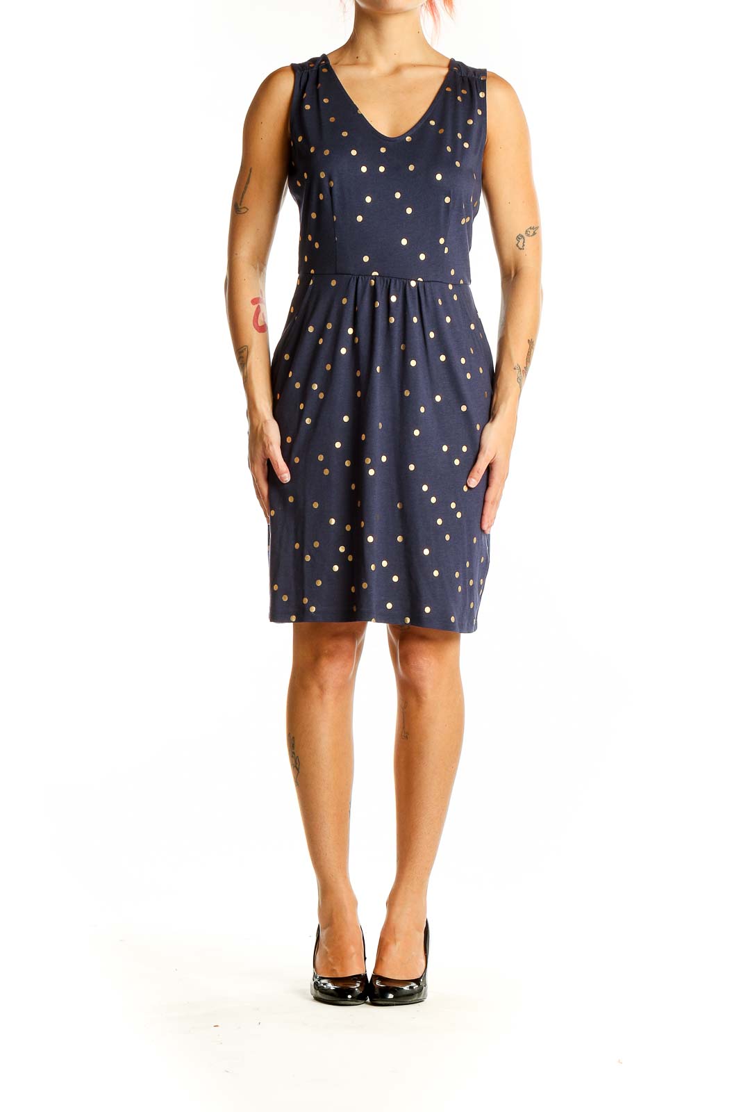 The fitted waist and gathered skirt add a touch of feminine flair, while the knee-length cut keeps it versatile and appropriate for various settings. The playful gold polka dot pattern adds a whimsical touch to the classic navy background, making this dress a standout piece in your wardrobe.