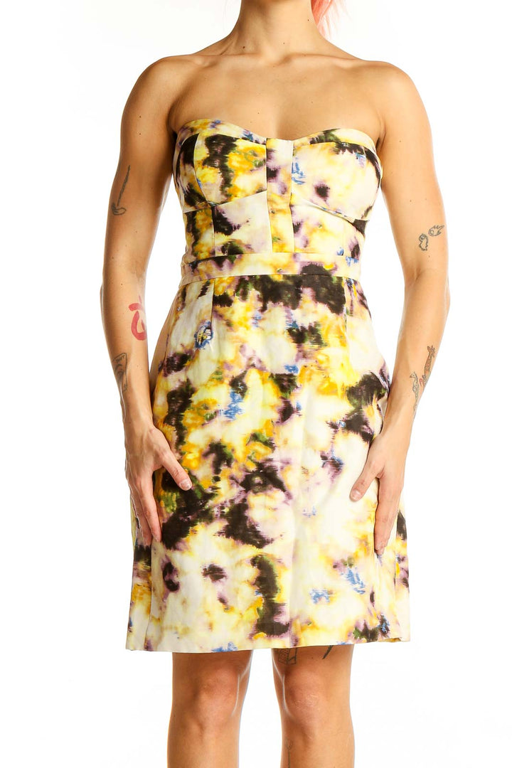 Make a statement at your next event with this stunning strapless cocktail dress from J.Crew. The eye-catching yellow floral print features splashes of blue, brown, and cream, creating a vibrant and artistic look. The fitted bodice and sweetheart neckline accentuate your curves, while the A-line skirt falls gracefully to just above the knee. Crafted from a luxurious blend of acetate, cotton, linen, and silk, this dress offers both comfort and elegance. The excellent condition ensures you'll look flawless all night long. With its versatile style, this dress is perfect for summer weddings, garden parties, or any special occasion where you want to stand out.
