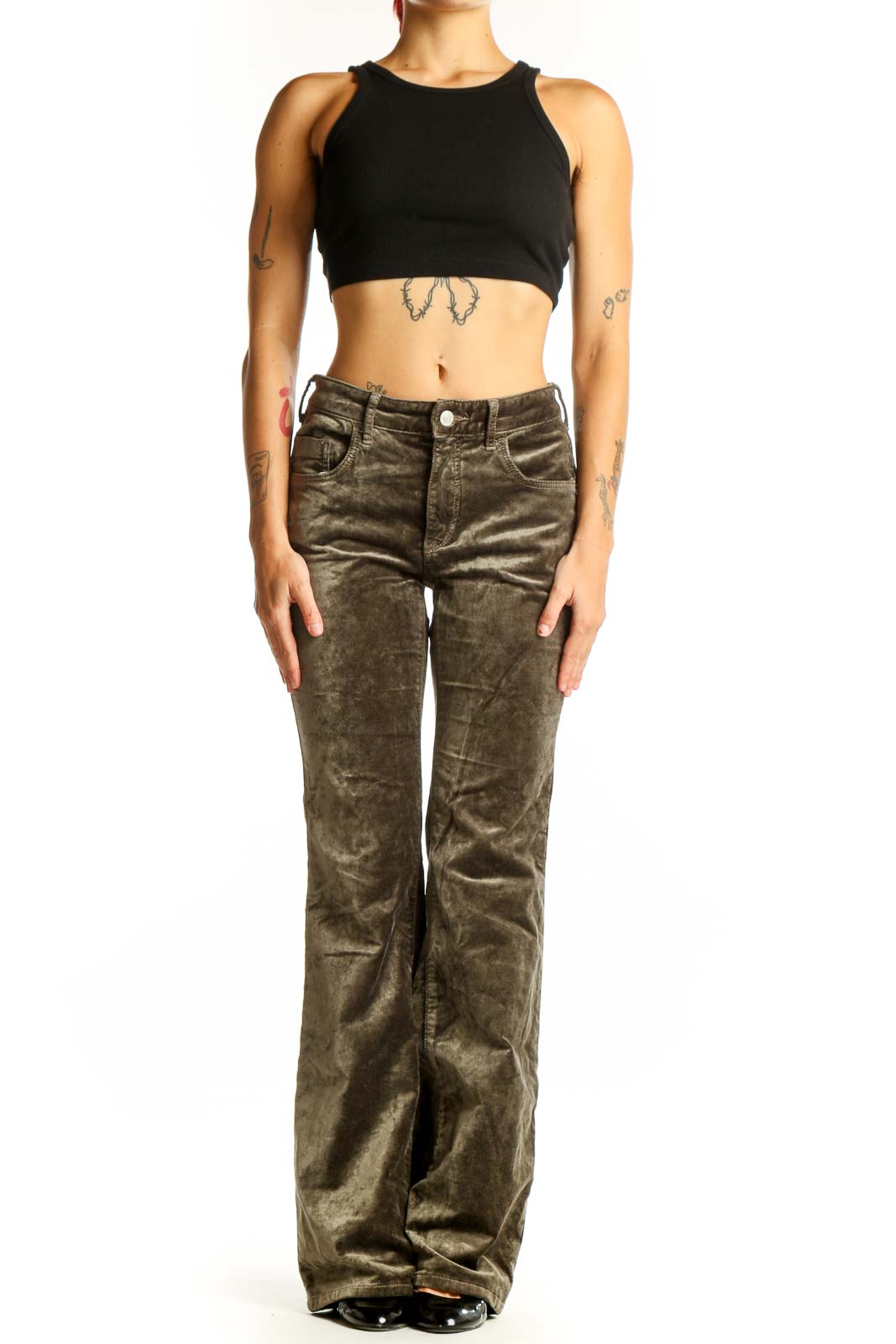 Step into luxurious comfort with these olive velvet flare pants from Pilcro. The rich, velvety texture of the cotton-elastane-viscose blend fabric offers a sumptuous feel and elegant drape. The flared silhouette creates a flattering, elongating effect on the legs, while the mid-rise waist provides a comfortable fit. Perfect for both casual outings and dressier occasions, these pants feature classic five-pocket styling and a zip fly with button closure. The excellent condition ensures these pants look as good as new. With a versatile 42" length and a 28" waist, these pants are designed to flatter a variety of body types. The deep olive hue adds a sophisticated touch to any outfit, making these pants a must-have addition to your wardrobe.
