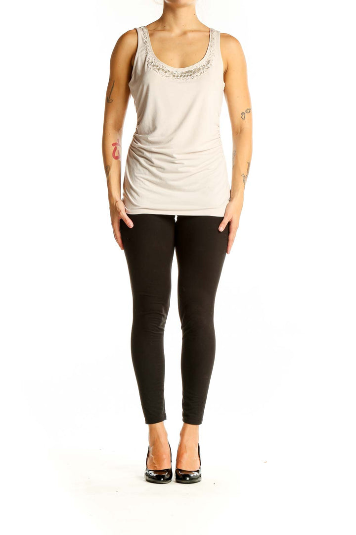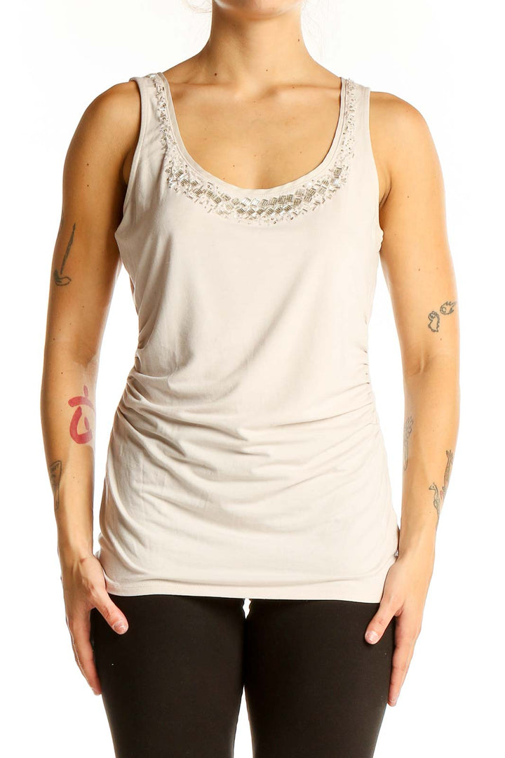 Elevate your casual wardrobe with this elegant beige sleeveless tank top from White House Black Market. Crafted from a luxurious blend of polyester, rayon, and spandex, this top offers both comfort and style. The scoop neckline is beautifully adorned with delicate embellishments, adding a touch of sophistication to this versatile piece.