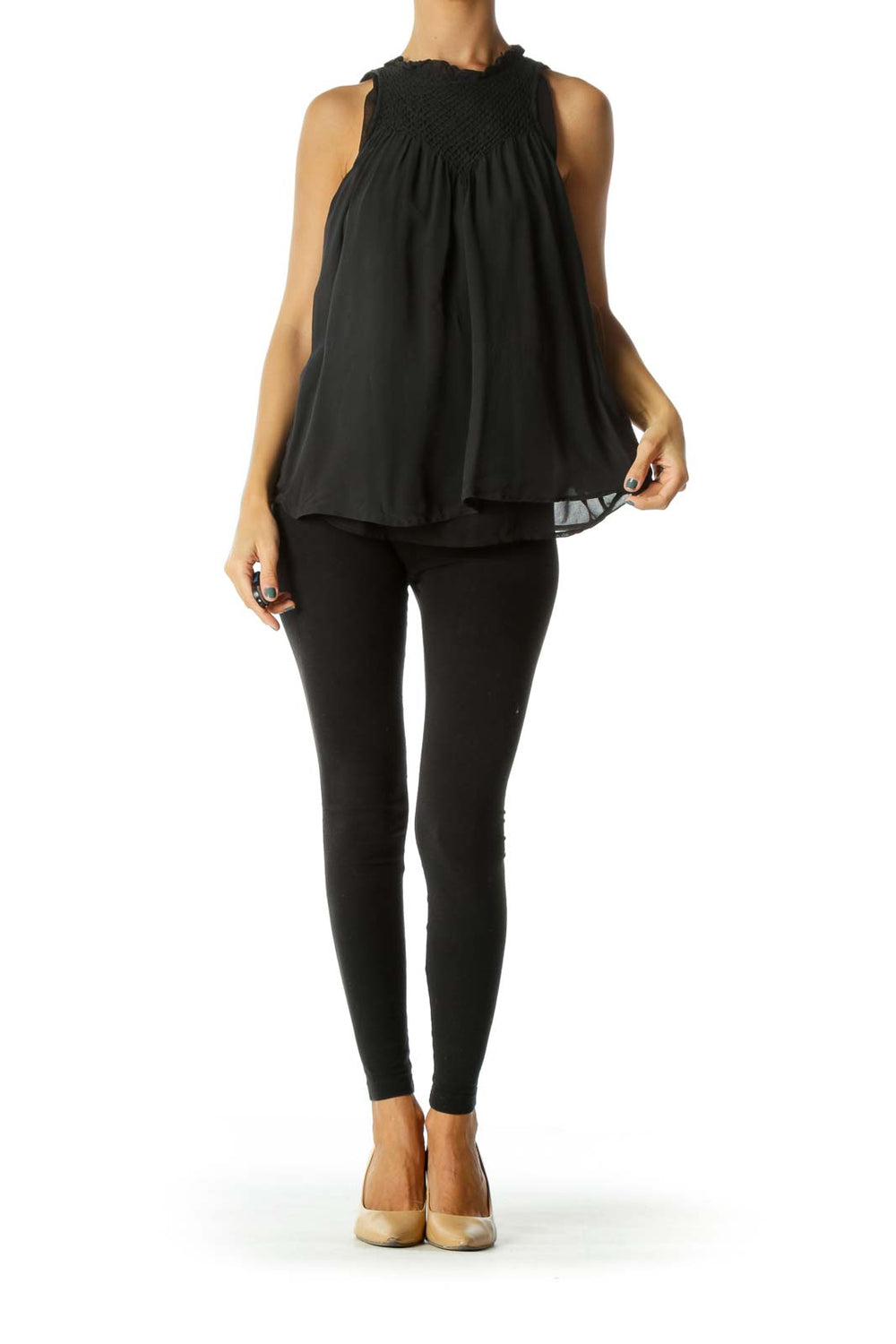 Faded Black Frontal Knit Ruffle Detail Keyhole Back Flared Tank Top