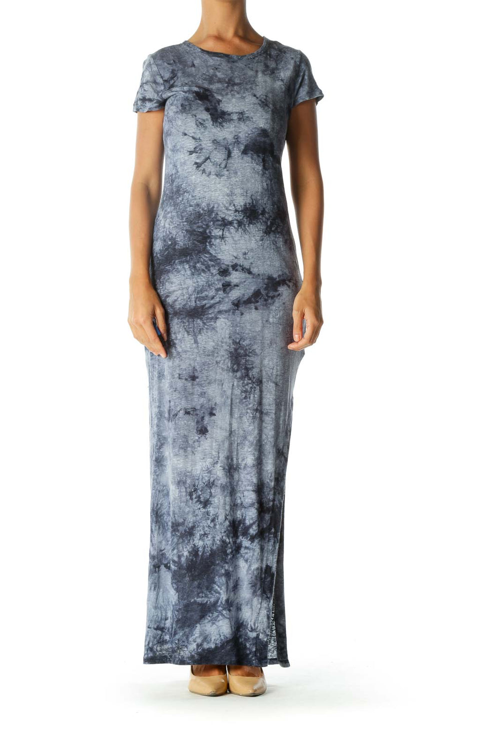 Blue 100% Linen Short Sleeve Tie Dye Design Side Openings Maxi Dress