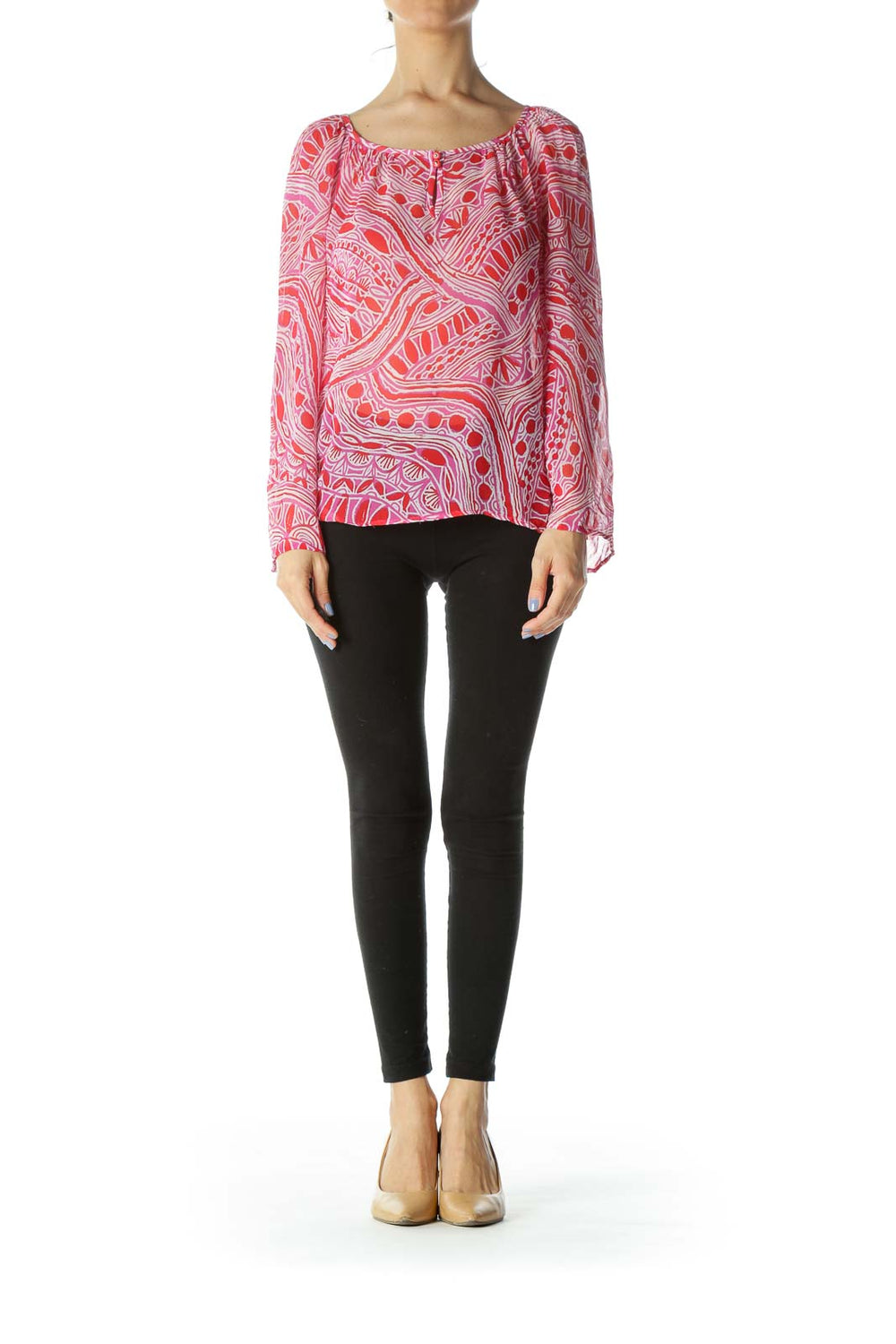 Red/Magenta-Pink/White Silk Print Keyhole See-Through Blouse
