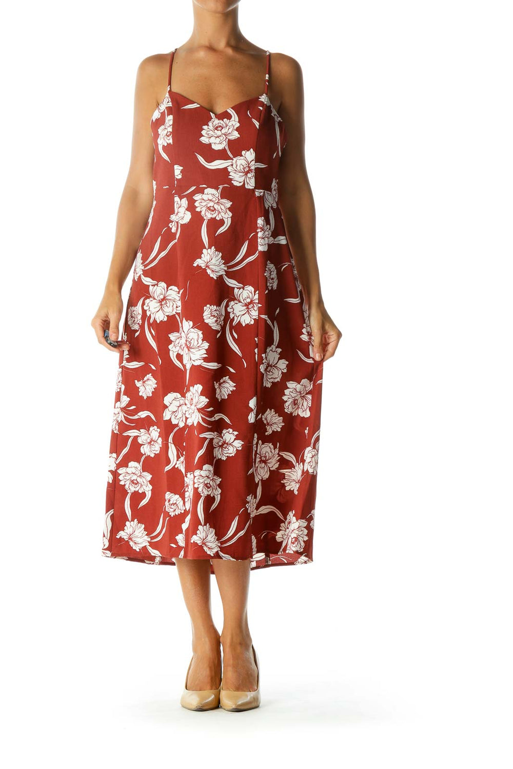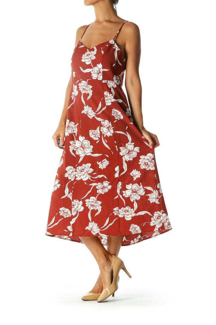 Brick Orange White Floral-Print V-Neck Spaghetti Straps Day Dress
