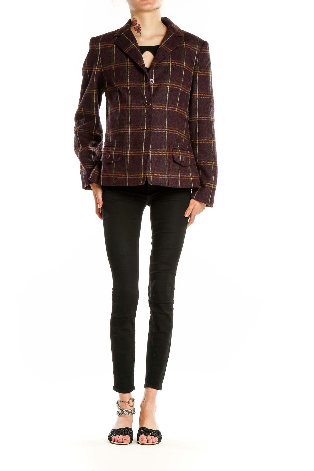 Step into timeless elegance with this exquisite burgundy plaid blazer from Talbots. Crafted from a luxurious wool blend, this jacket showcases a sophisticated windowpane pattern in rich shades of burgundy, accented with subtle yellow lines. The classic notched lapel and three-button front closure offer a refined silhouette, perfect for both office wear and smart casual occasions.