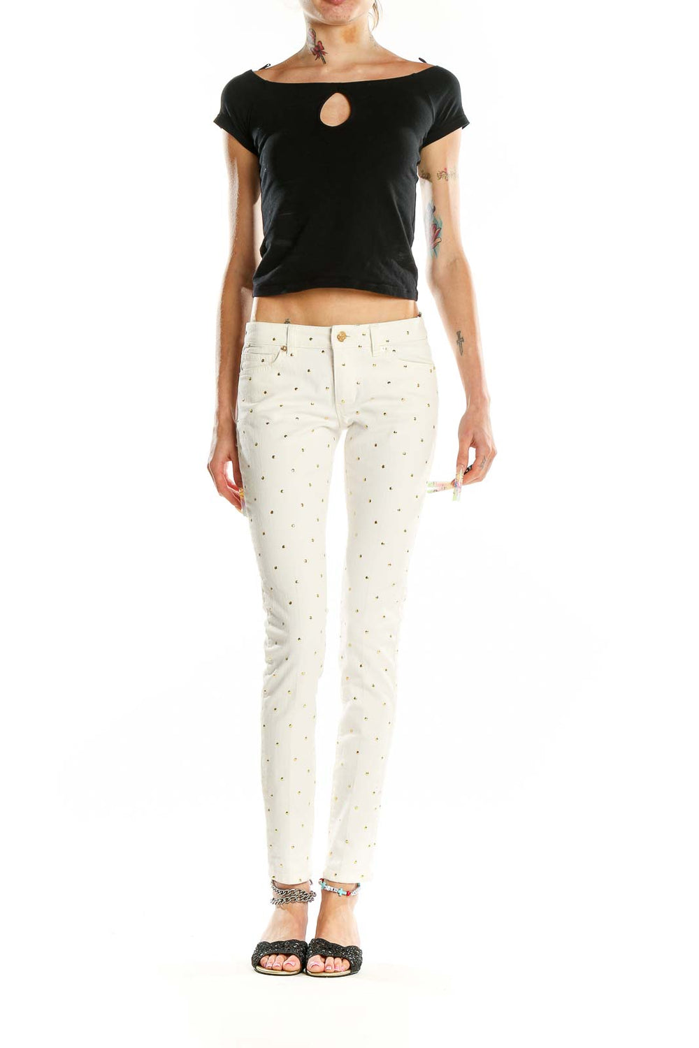 Step into style with these charming white polka dot skinny jeans from MICHAEL Michael Kors. These eye-catching denim pants feature a playful all-over dot pattern that adds a touch of whimsy to your casual wardrobe. Crafted from a comfortable blend of cotton and spandex, these jeans offer both durability and stretch for all-day comfort.