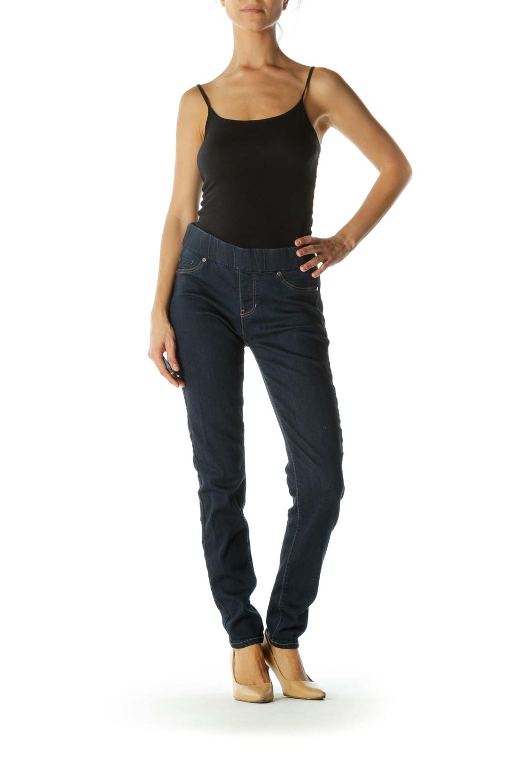 Blue Dark-Wash Elastic Waist-Band Faux-Front-Pockets Denim Legging