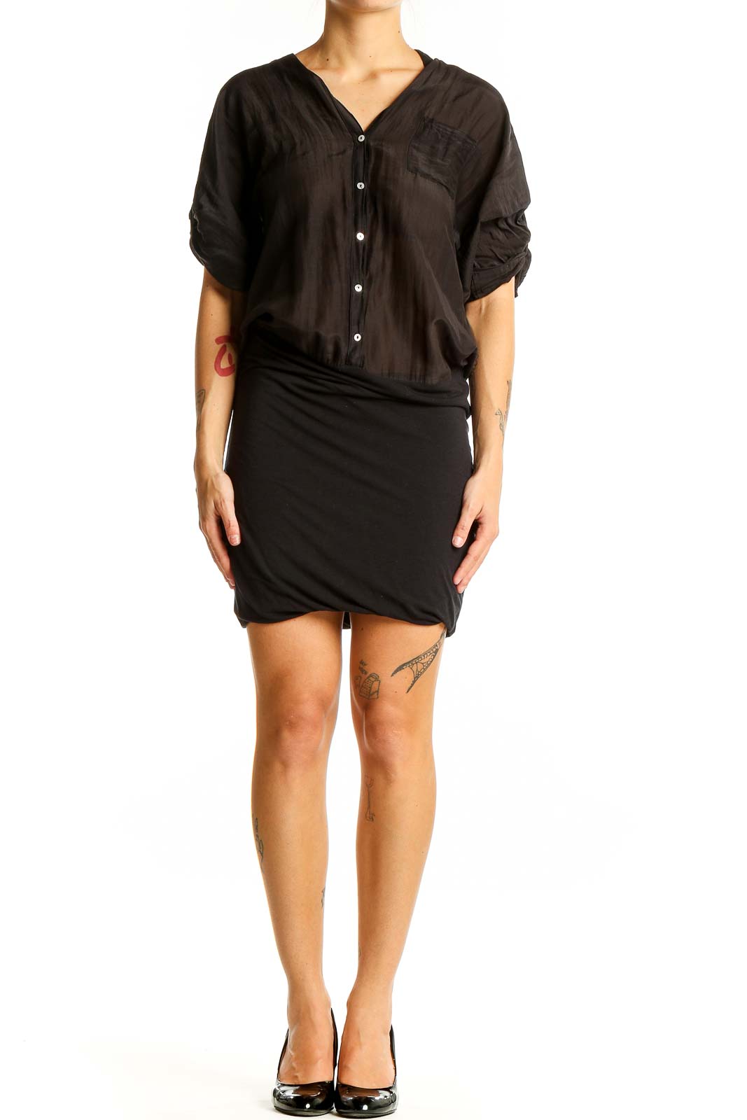 Elevate your wardrobe with this versatile black shirt dress from Splendid. Crafted from a comfortable blend of polyester, rayon, and spandex, this dress offers both style and ease of wear. The button-down front adds a classic touch, while the rolled-up sleeves create a casual, relaxed vibe. The dress features a flattering silhouette with a cinched waist and a slightly flared skirt that falls just above the knee. Perfect for both office wear and casual outings, this dress can be easily dressed up or down with the right accessories. The good condition of this pre-loved piece ensures you'll enjoy its timeless appeal for years to come.