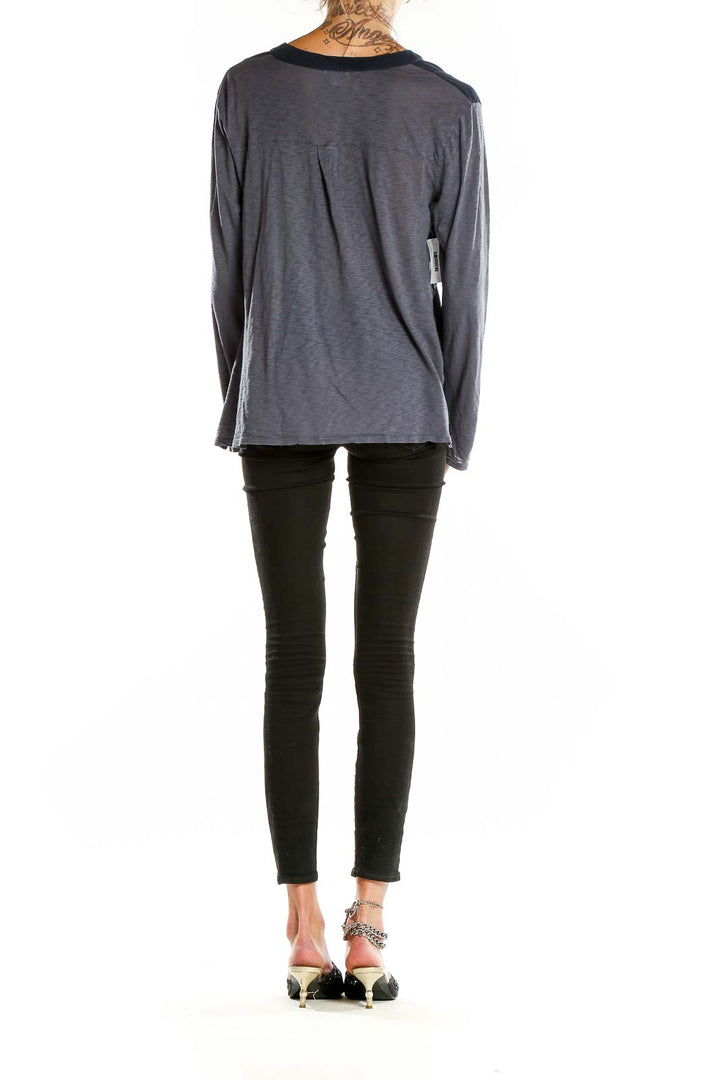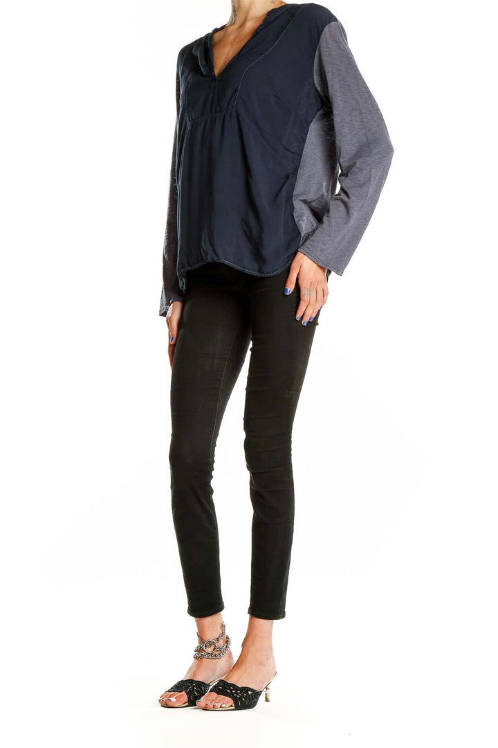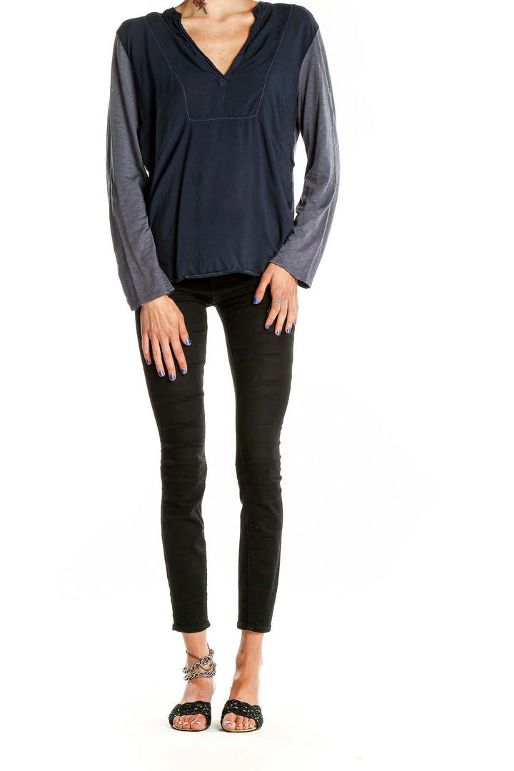Elevate your casual wardrobe with this stylish Splendid color block top. The navy front panel creates a flattering V-neck silhouette, while the contrasting gray long sleeves add a modern twist. Crafted from a soft blend of cotton, polyester, rayon, and spandex, this top offers both comfort and durability.