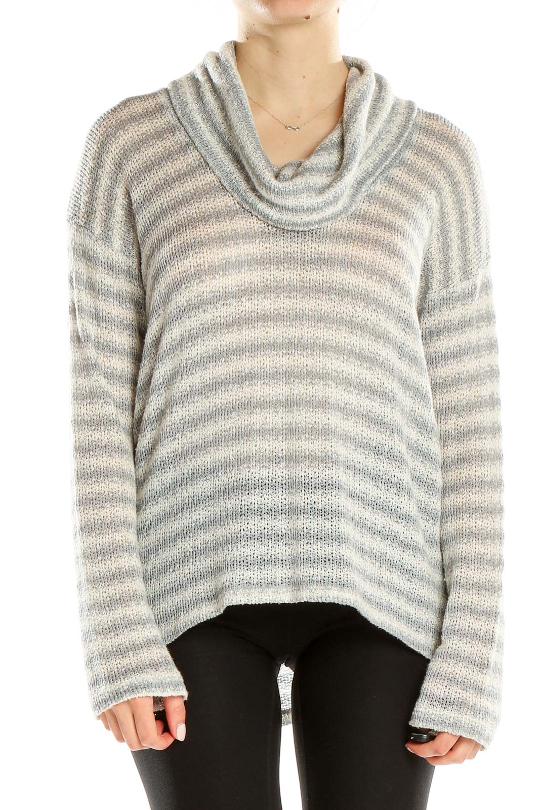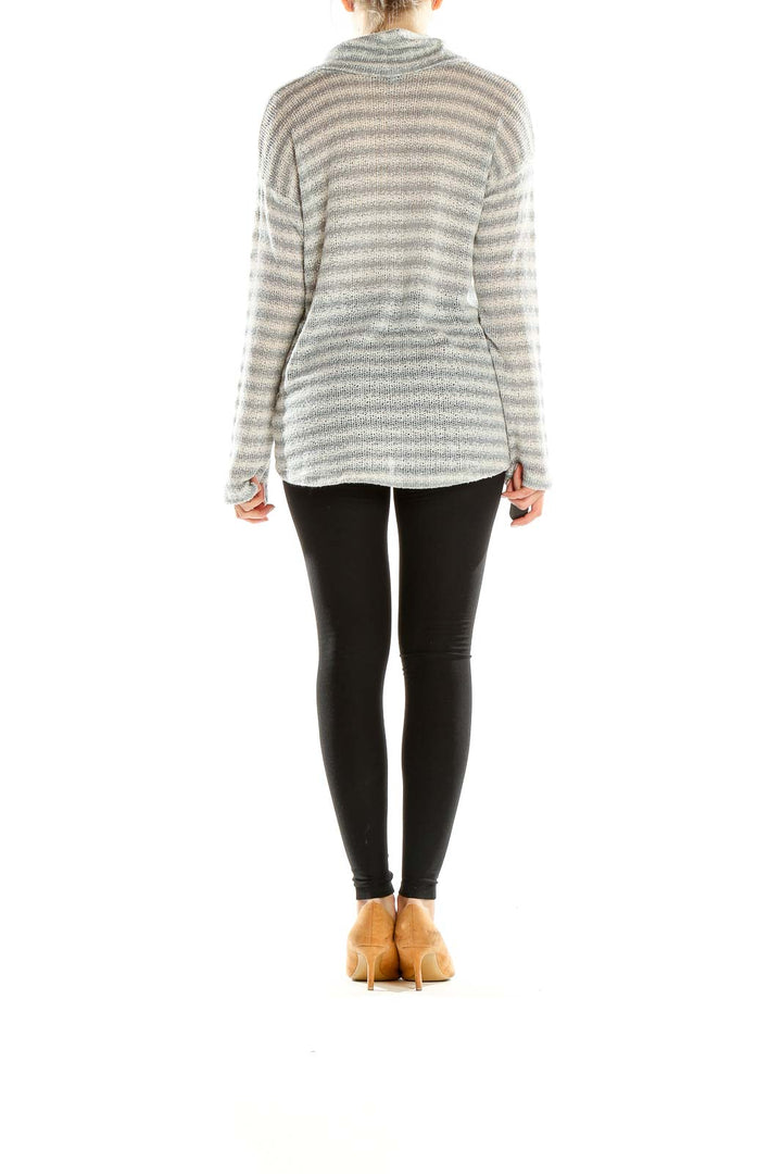 Designed for a comfortable fit, this sweater features dropped shoulders and long sleeves, perfect for those cooler days or cozy nights in. The subtle contrast between the light gray and white stripes creates a versatile piece that can be easily paired with your favorite jeans, leggings, or skirts.