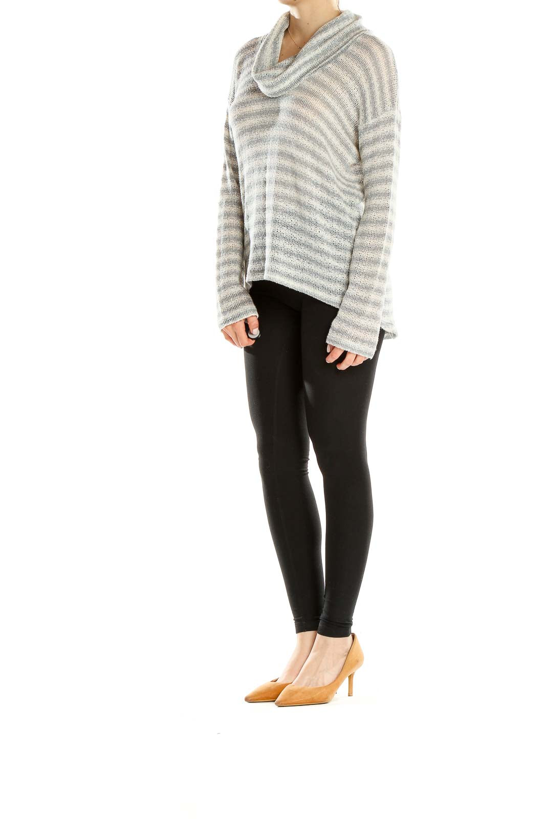 Embrace comfort and style with this exquisite gray and white striped cowl neck sweater from Splendid. The soft, lightweight knit fabric drapes beautifully, creating a relaxed and effortlessly chic silhouette. The cowl neck adds a touch of elegance, while the horizontal stripes offer a classic, timeless appeal.