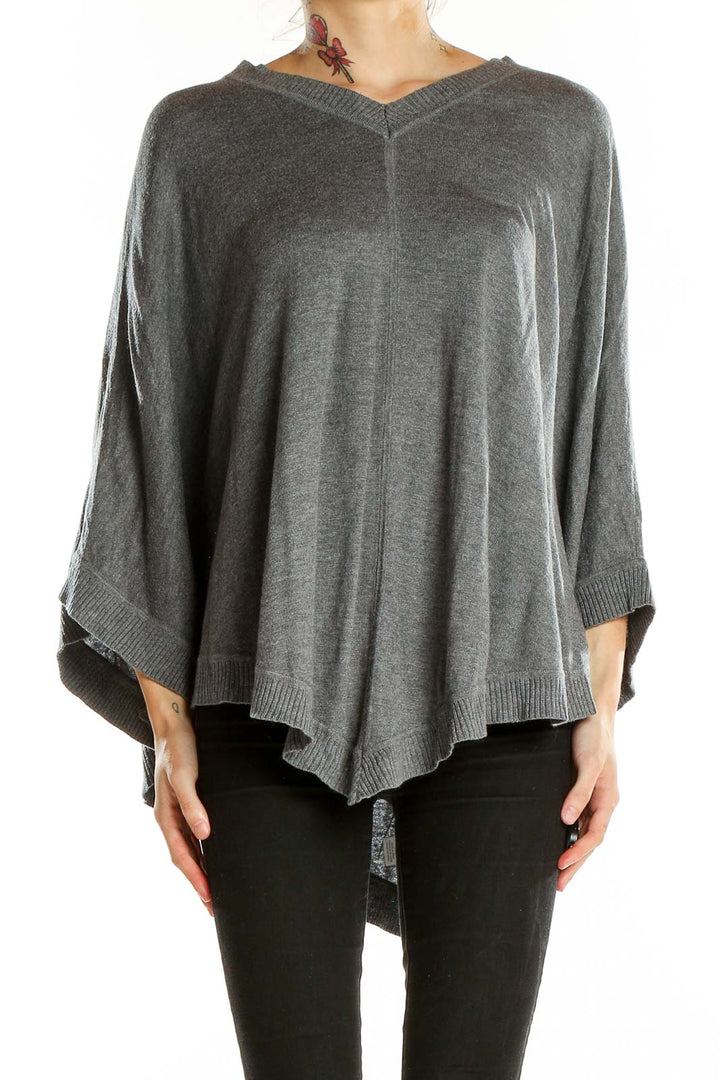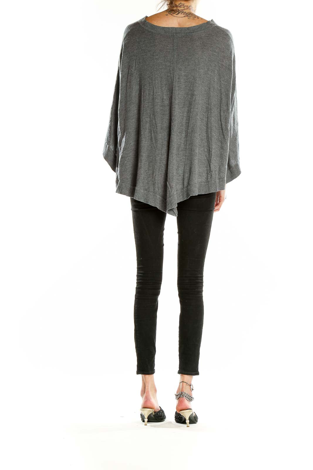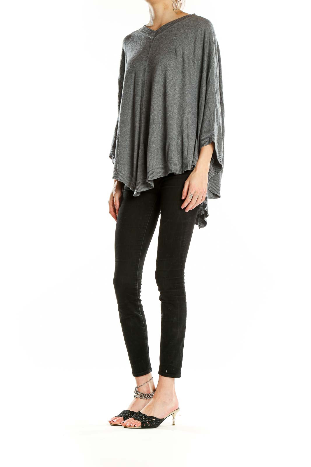 The poncho's asymmetrical hemline adds a touch of modern flair, while the ribbed edges provide a polished finish. Its generous cut allows for easy layering over various outfits, from simple tees to long-sleeved tops. The muted gray color is a timeless choice that pairs effortlessly with any ensemble.