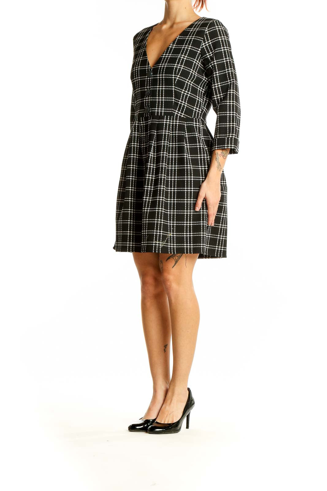 Make a stylish statement with this chic black and white plaid mini dress from Zara Trafaluc. The eye-catching pattern adds a trendy touch to this versatile piece, perfect for both casual outings and dressier occasions. Featuring a flattering V-neckline and 3/4 length sleeves, this dress offers a comfortable yet fashionable fit. The button-down front adds a classic detail, while the gathered waist creates a feminine silhouette. Made from a soft, lightweight fabric, this dress ensures all-day comfort. In excellent condition, this Zara Trafaluc dress is a must-have addition to your wardrobe.