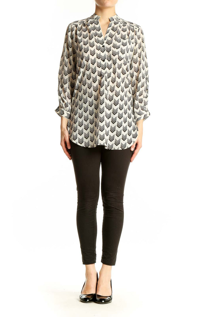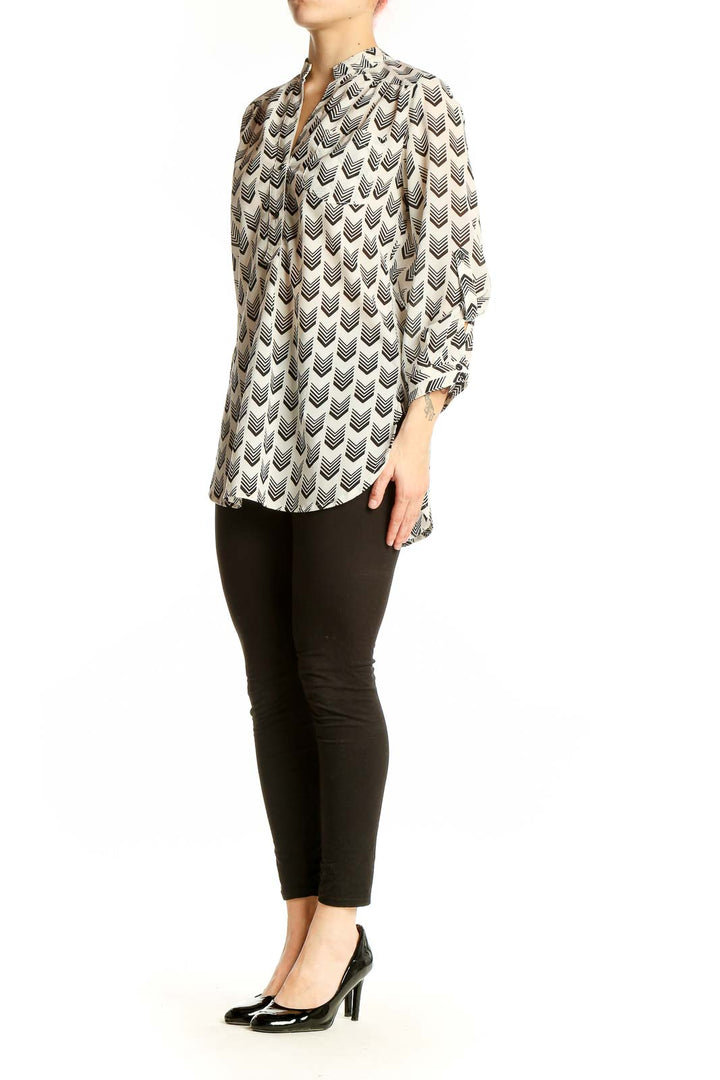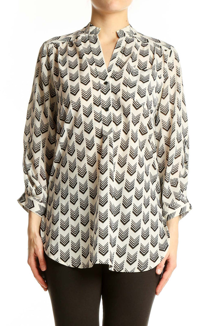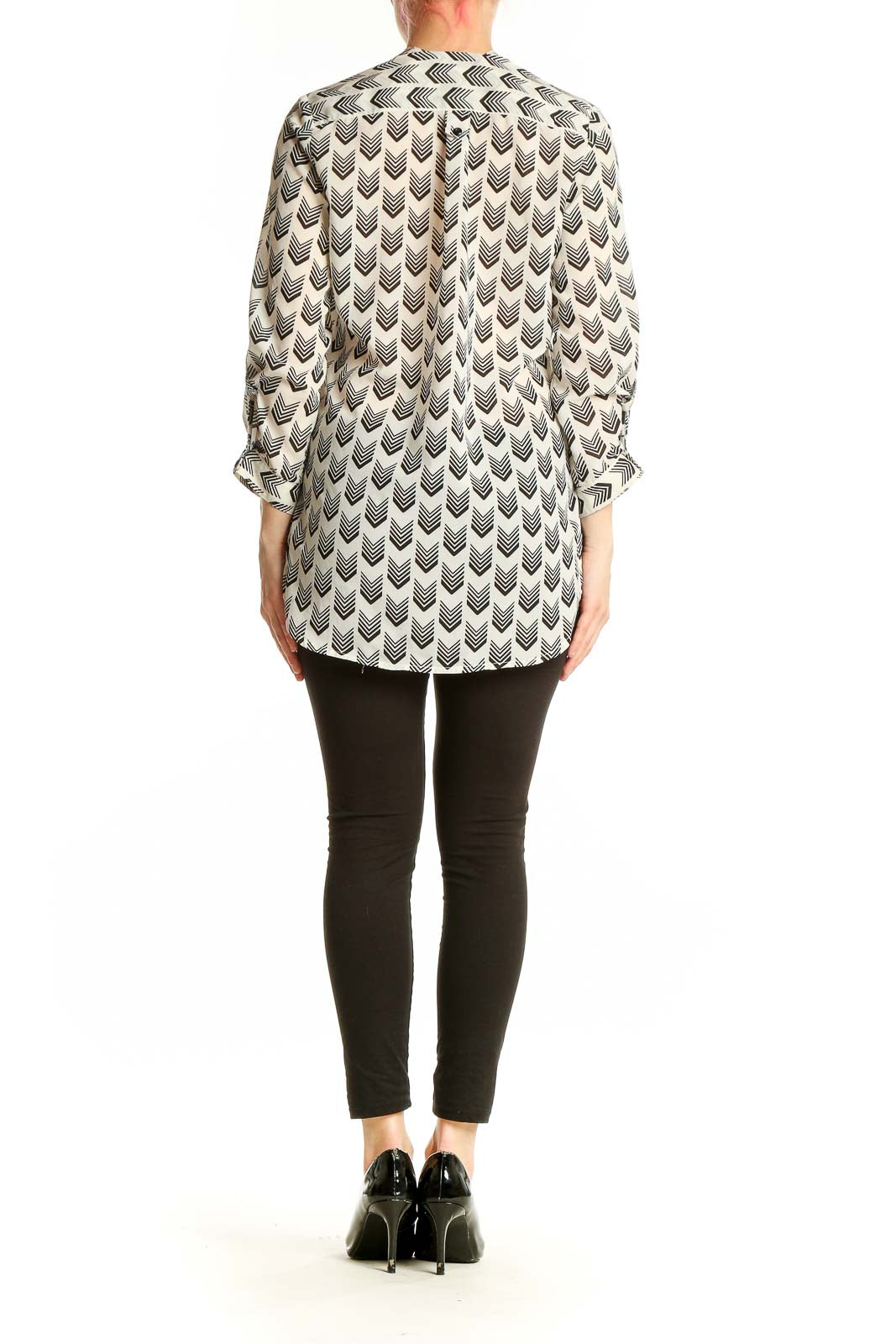 Make a stylish statement with this eye-catching 41 Hawthorn blouse. Featuring a striking black and white chevron print, this polyester top combines comfort with contemporary flair. The V-neck design and 3/4 length sleeves offer a flattering silhouette suitable for both office and casual wear. With its excellent condition and generous measurements (Bust 38", Length 30", Waist 34"), this size Small blouse ensures a comfortable fit for various body types. The lightweight fabric drapes beautifully, making it perfect for layering or wearing on its own. Elevate your wardrobe with this versatile piece that effortlessly transitions from day to night.