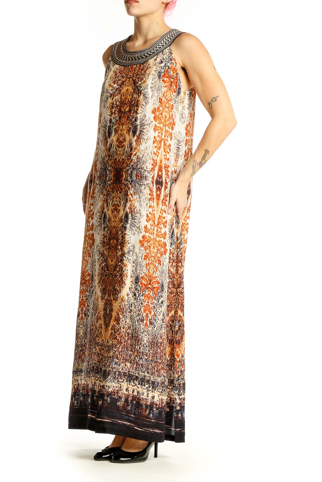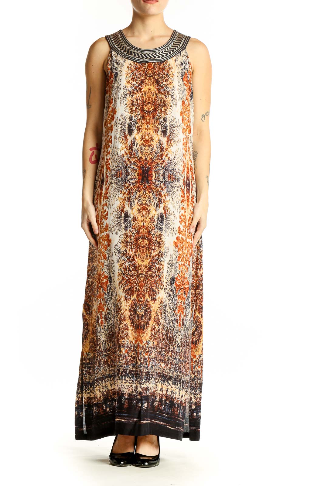 Step into elegance with this stunning orange floral maxi dress by NIC + ZOE. The dress features a captivating all-over print in warm autumn hues, creating a mesmerizing kaleidoscope effect. The sleeveless design is perfect for warm weather, while the intricate embroidered neckline adds a touch of sophistication.