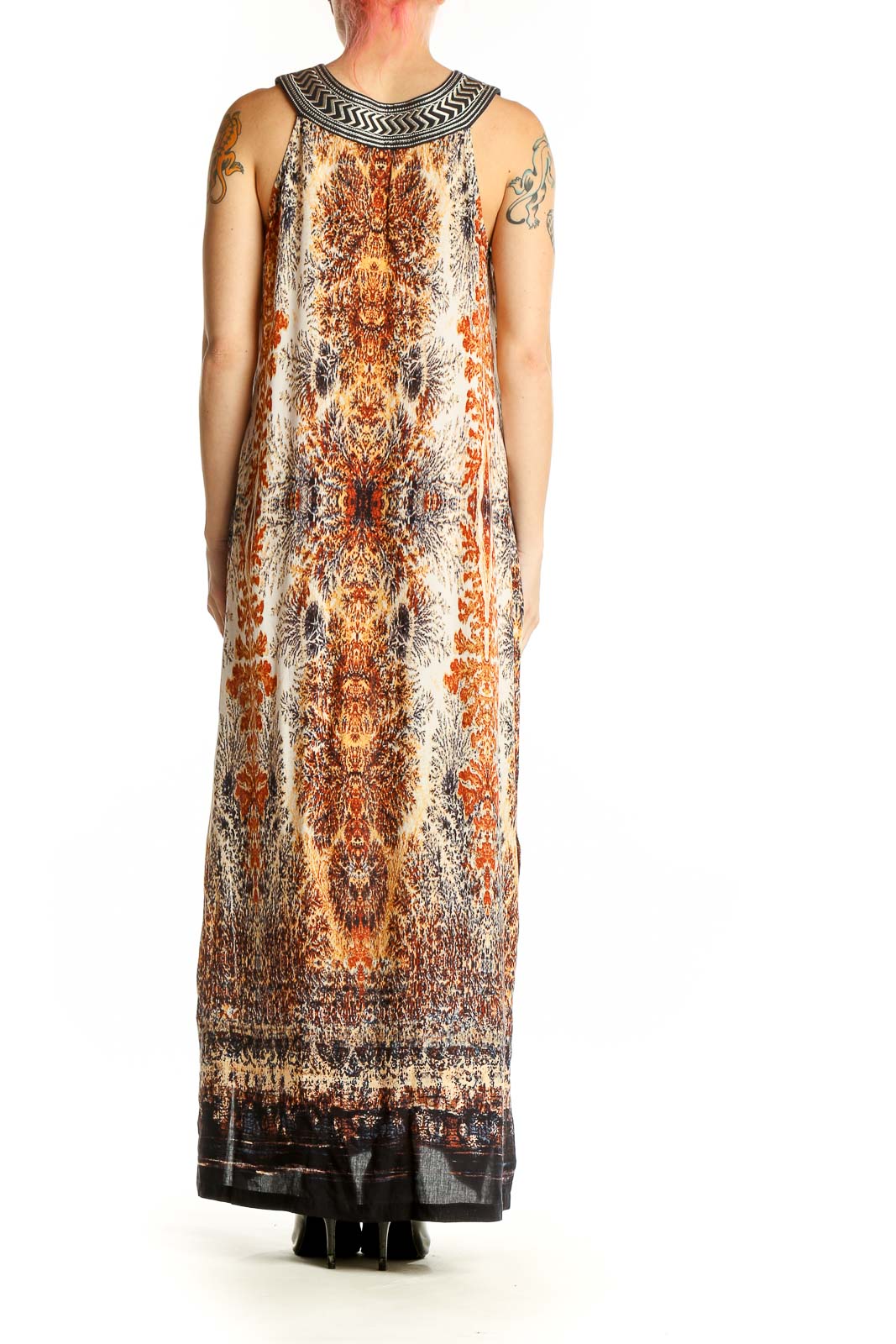 Crafted from soft and flowing rayon, this dress offers both comfort and style. The maxi length provides a graceful silhouette, ideal for various occasions from casual outings to semi-formal events. The dress showcases a beautiful blend of orange, brown, and cream tones, accented with a contrasting black border at the hem for added visual interest.