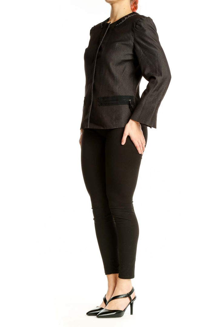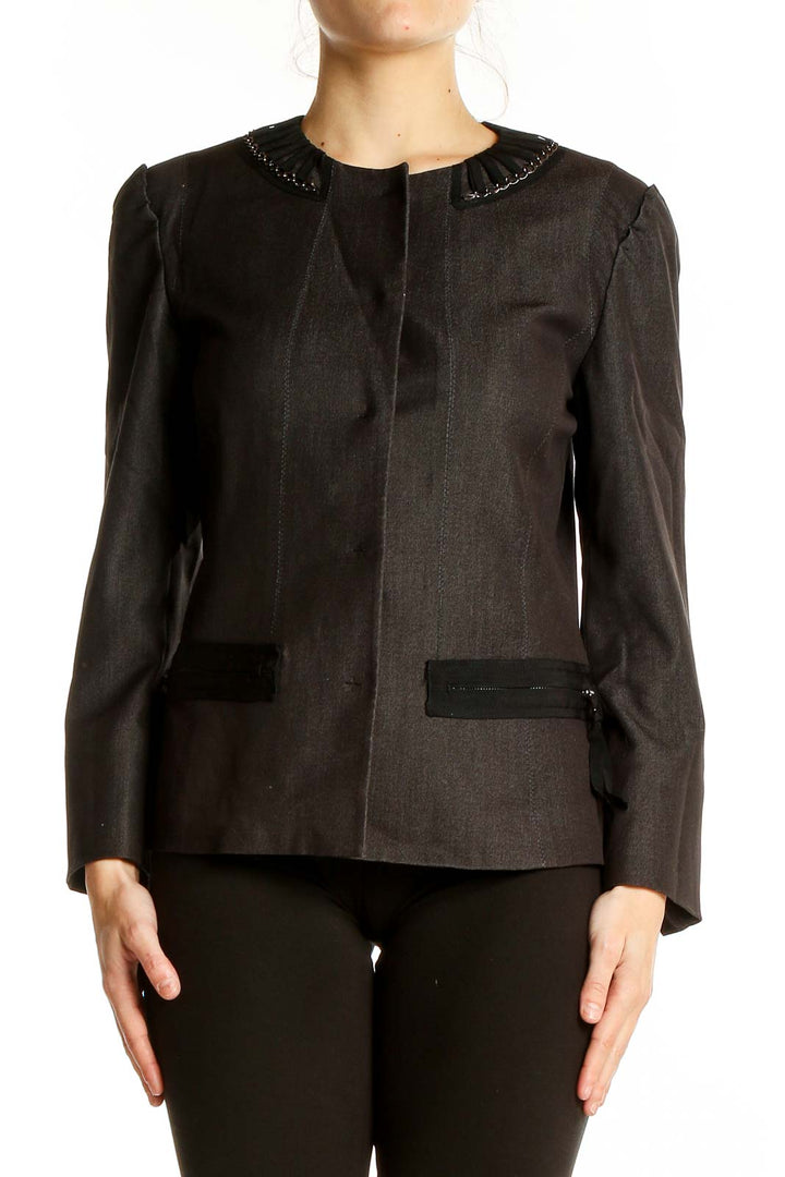 Elevate your professional wardrobe with this sophisticated black blazer from T Tahari. Crafted from a luxurious blend of elastane, polyester, rayon, and viscose, this jacket offers both comfort and style. The standout feature is the embellished collar, adding a touch of glamour to the classic silhouette. With a sleek design and clean lines, this blazer transitions effortlessly from day to night. The excellent condition ensures you'll look polished and put-together for any occasion. Tailored to perfection, it features a flattering fit with measurements of 34" bust, 31" waist, and 23" length, ideal for a size Small. The hidden front closure and subtle pockets maintain a streamlined appearance, while the embellished collar adds just the right amount of sparkle. This T Tahari blazer is a versatile piece that will quickly become a staple in your professional and evening wear collection.