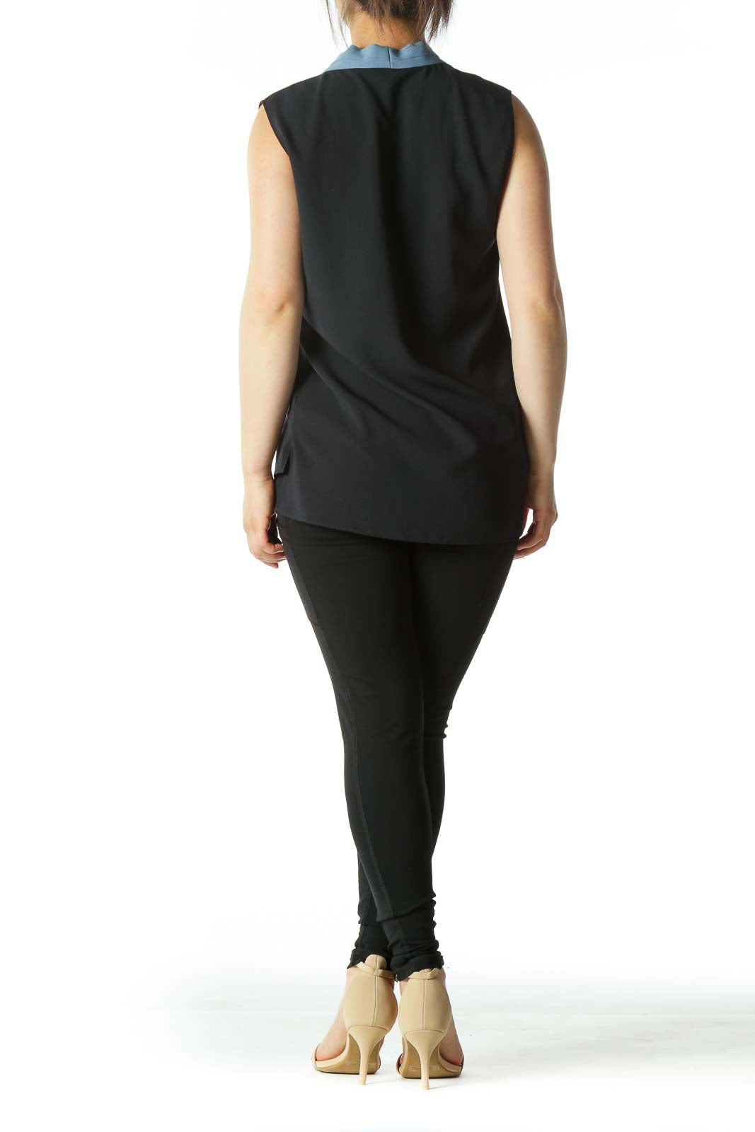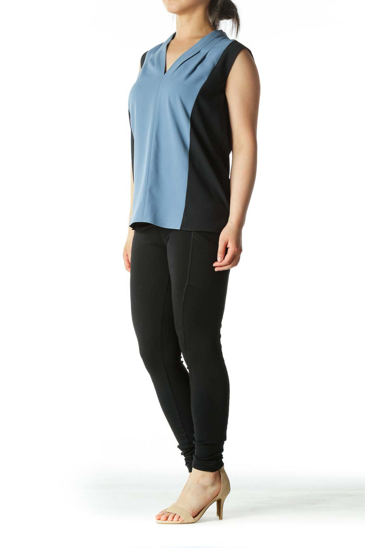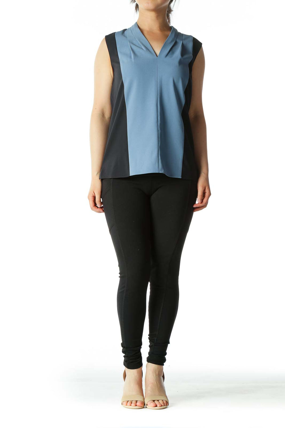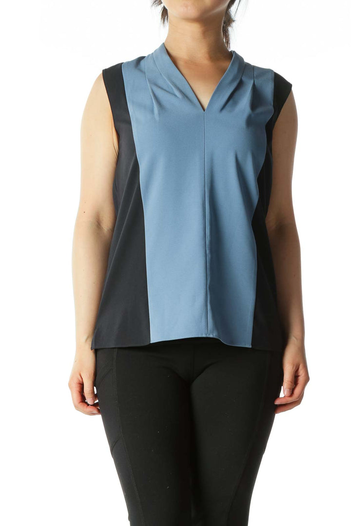 Light Blue and Navy Color-Block V-Neck Sleeveless Blouse