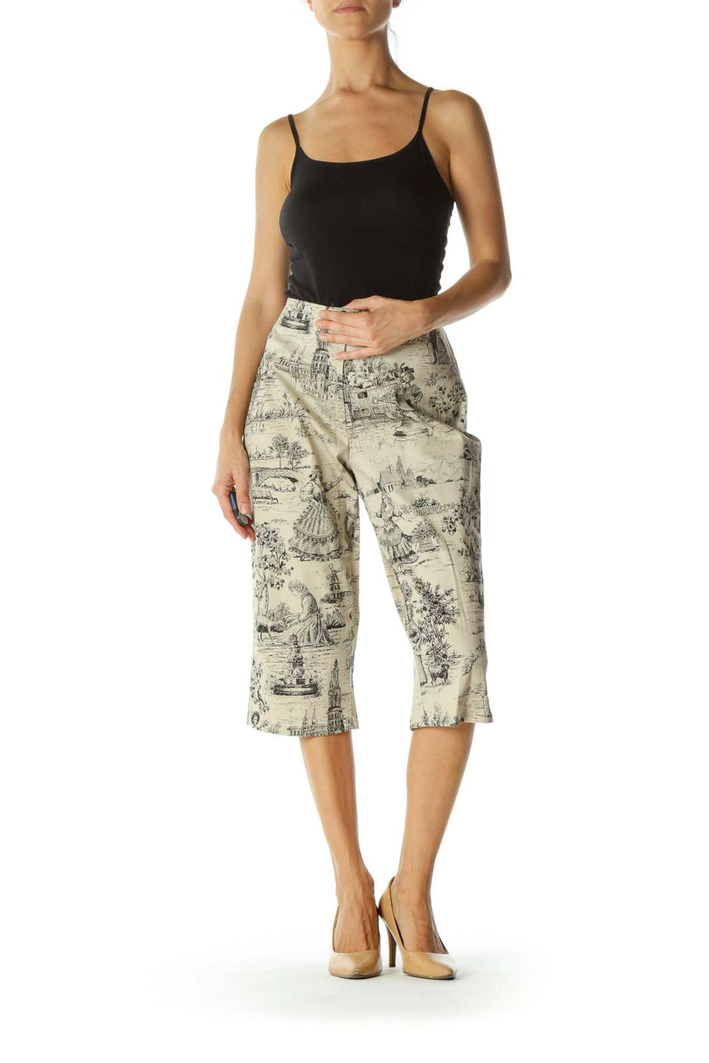 Beige Black Period Print Scenes Cropped Zippered High-Waist Stretch Pants (Altered)
