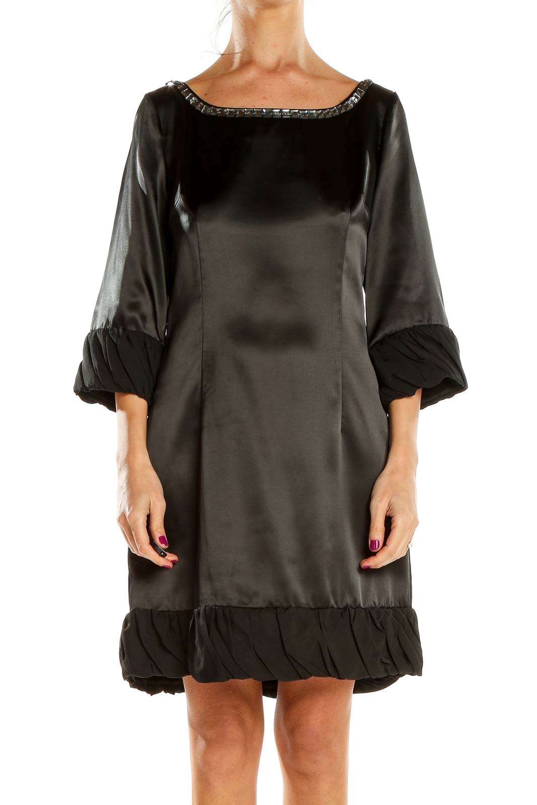 Front view of Pollini black satin cocktail dress with beaded neckline and ruffle trim