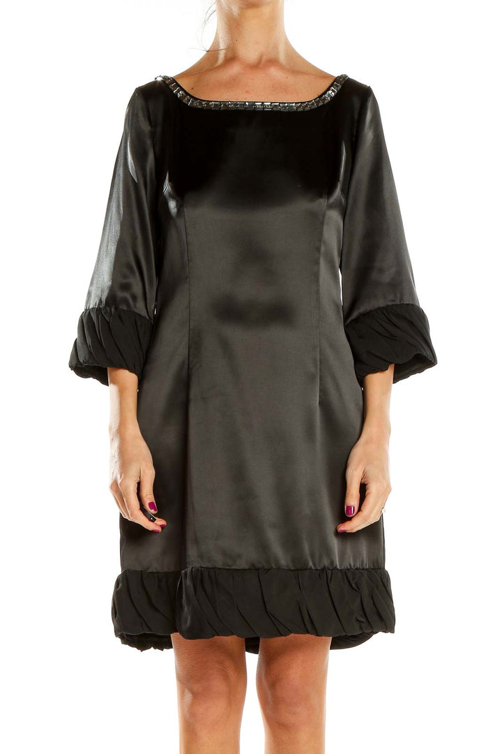Black Satin Cocktail Dress with Ruffle Trim