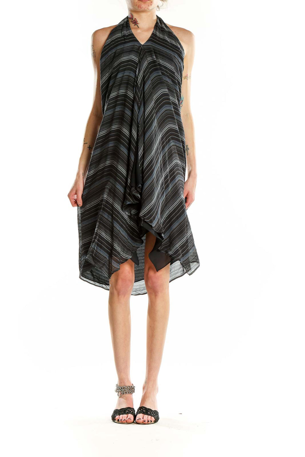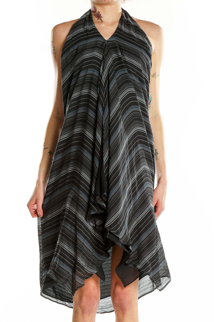 The dress showcases a mesmerizing pattern of thin black, gray, and blue stripes that create a sense of movement and depth. Its sleeveless design and open back make it perfect for warm evenings or special occasions. The lightweight fabric drapes beautifully, accentuating your curves while providing a comfortable fit.