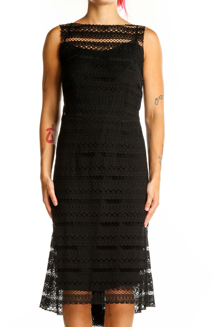 Elevate your evening attire with this exquisite black lace midi dress by Monique Lhuillier. This sophisticated piece features an intricate all-over lace design, creating a stunning semi-sheer effect that exudes elegance and allure. The sleeveless silhouette and high neckline offer a classic look, while the sheer yoke adds a touch of modern glamour.