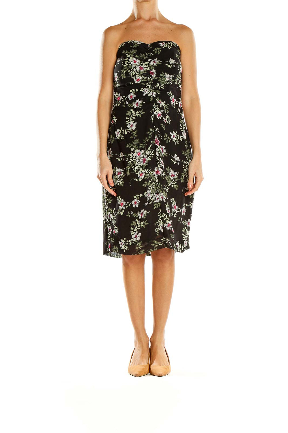 Elevate your evening attire with this stunning black floral strapless cocktail dress by Nicole Miller. The dress features a beautiful all-over print of delicate green leaves and pink flowers, creating a romantic and feminine look. The strapless design showcases your shoulders and décolletage, while the fitted bodice and empire waistline accentuate your silhouette. Made from a luxurious fabric that drapes elegantly, this dress falls to a flattering knee length, perfect for cocktail parties or special occasions. The excellent condition of this size small dress ensures you'll look and feel your best. With its versatile design and timeless appeal, this Nicole Miller creation is sure to become a favorite in your wardrobe.