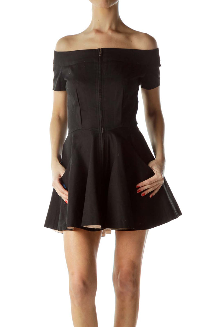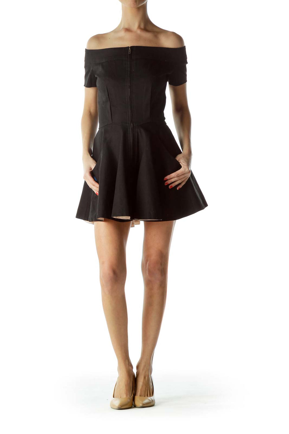 Front view of black off-shoulder mini dress with fitted bodice and flared skirt