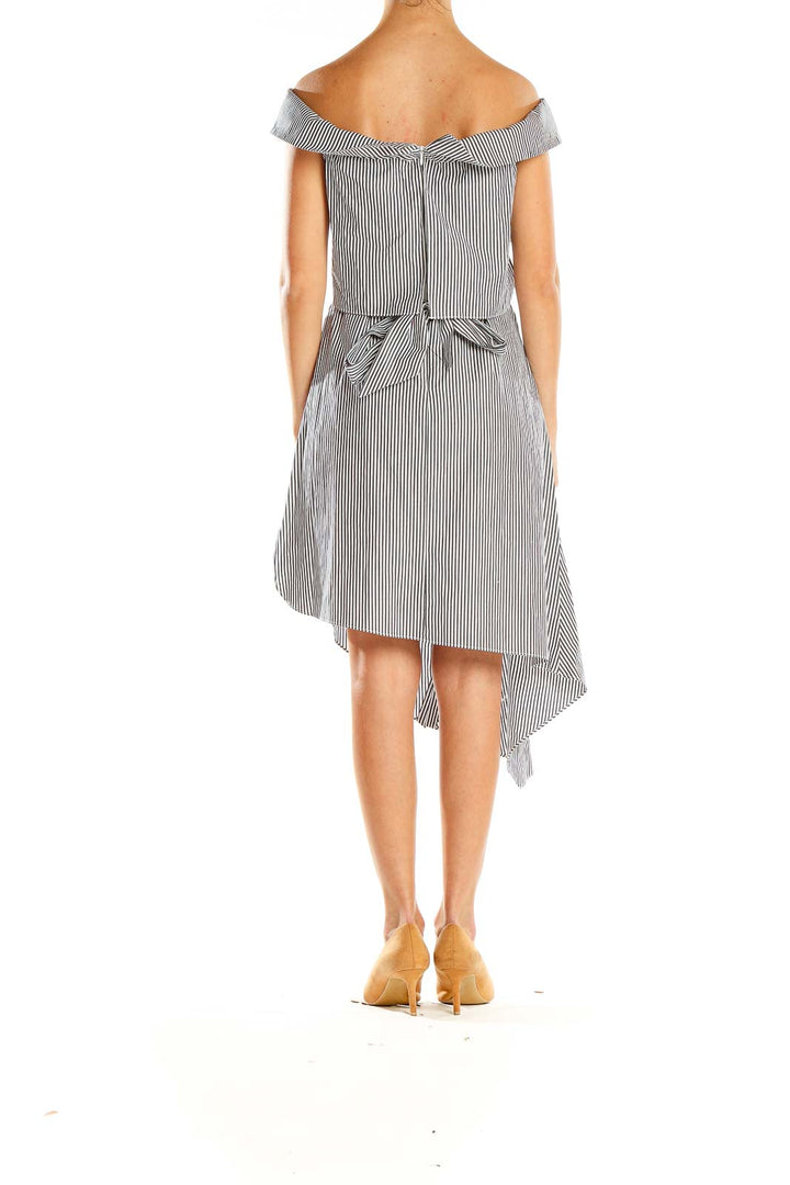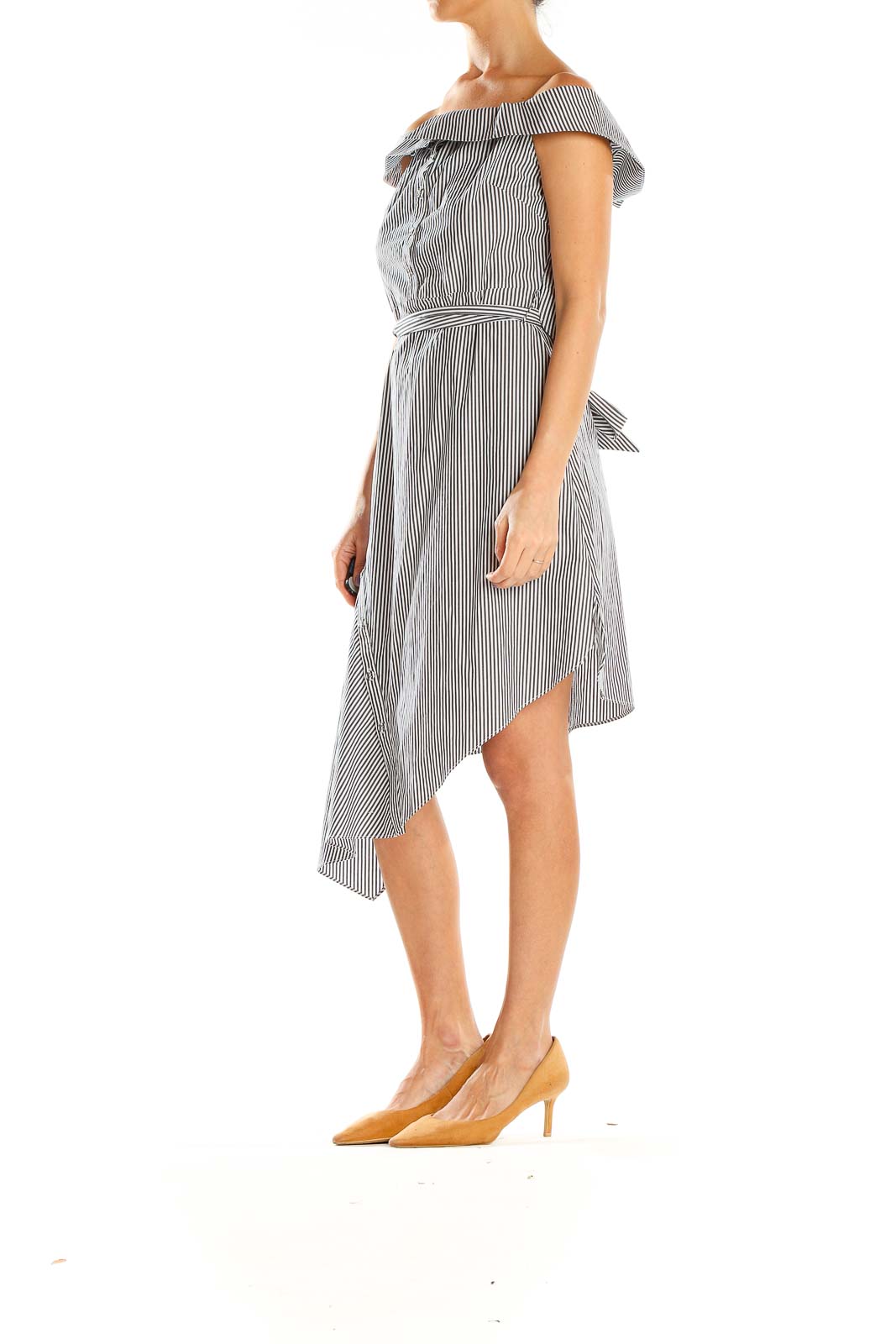 The dress cinches at the waist with a matching fabric belt, creating a flattering silhouette. Its asymmetric hemline adds a modern twist to the classic striped design, falling gracefully just below the knee. Perfect for various occasions, this versatile piece can be dressed up or down with the right accessories.