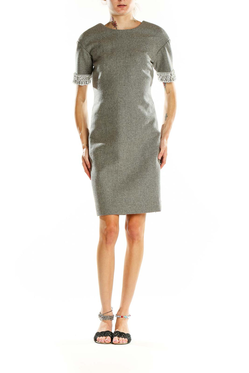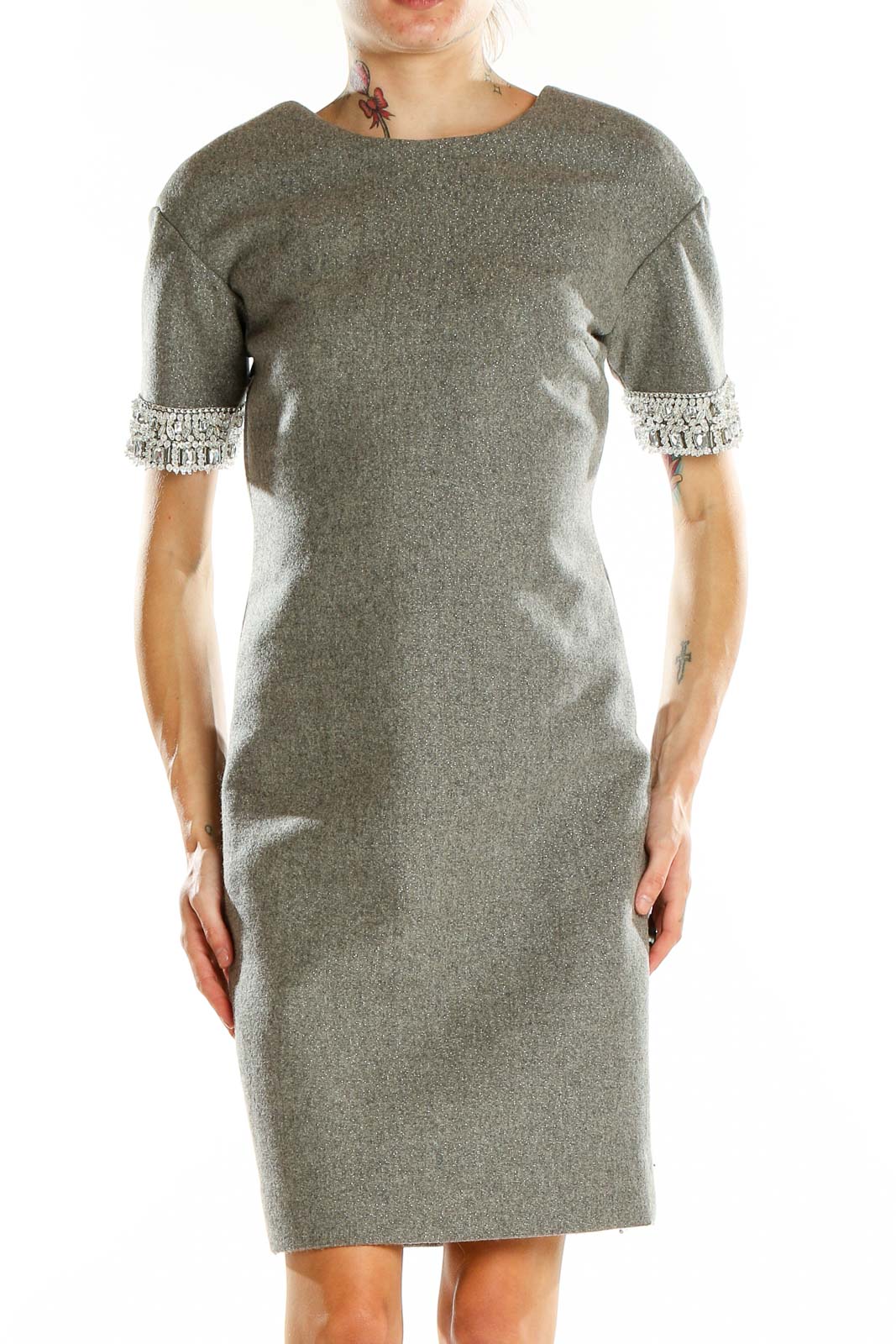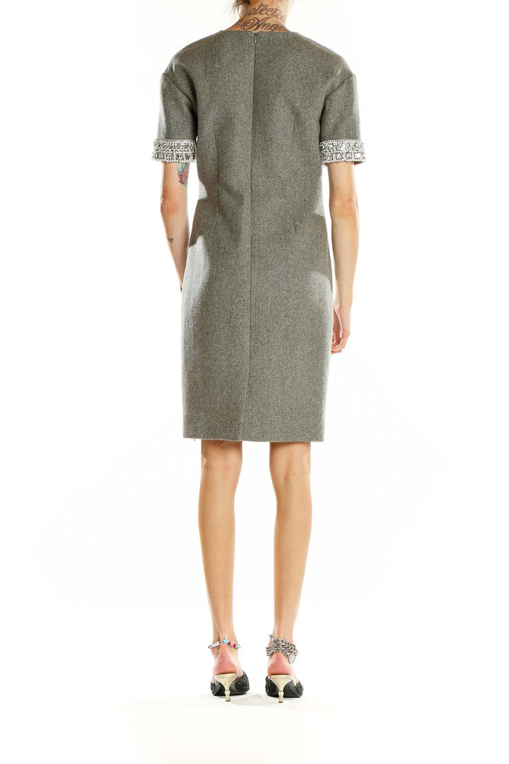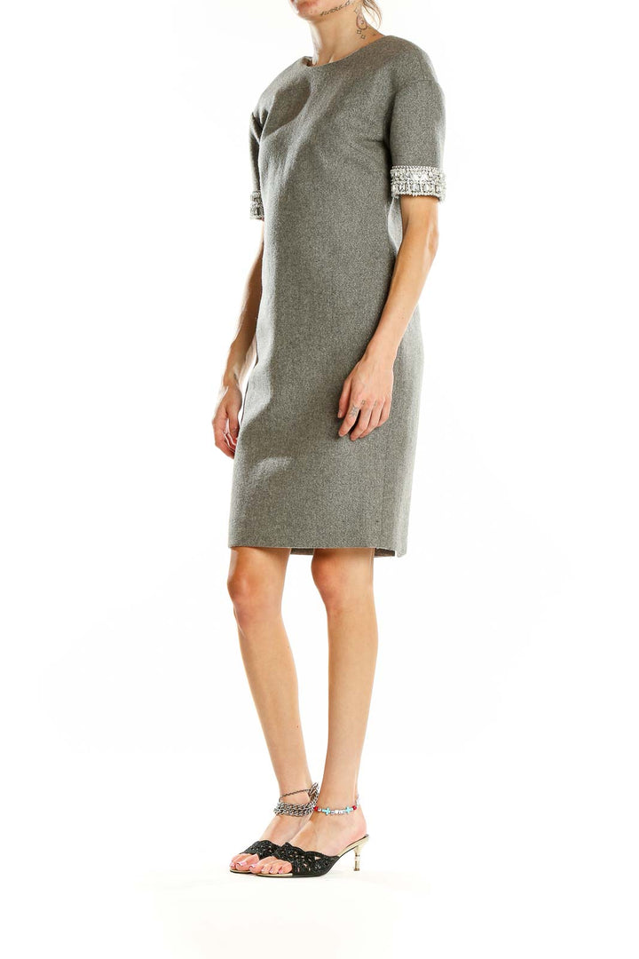 Elevate your wardrobe with this sophisticated gray wool sheath dress from J.Crew Collection. This elegant piece features a classic silhouette that flatters the figure, crafted from high-quality wool for warmth and comfort. The dress is adorned with eye-catching embellished cuffs on the short sleeves, adding a touch of glamour to the otherwise understated design. Perfect for both office wear and evening events, this versatile dress offers a timeless appeal. The excellent condition of this XS-sized garment ensures you'll look polished and put-together for any occasion. With its modest knee-length cut and tailored fit, this dress is a testament to J.Crew's commitment to refined style and quality craftsmanship.