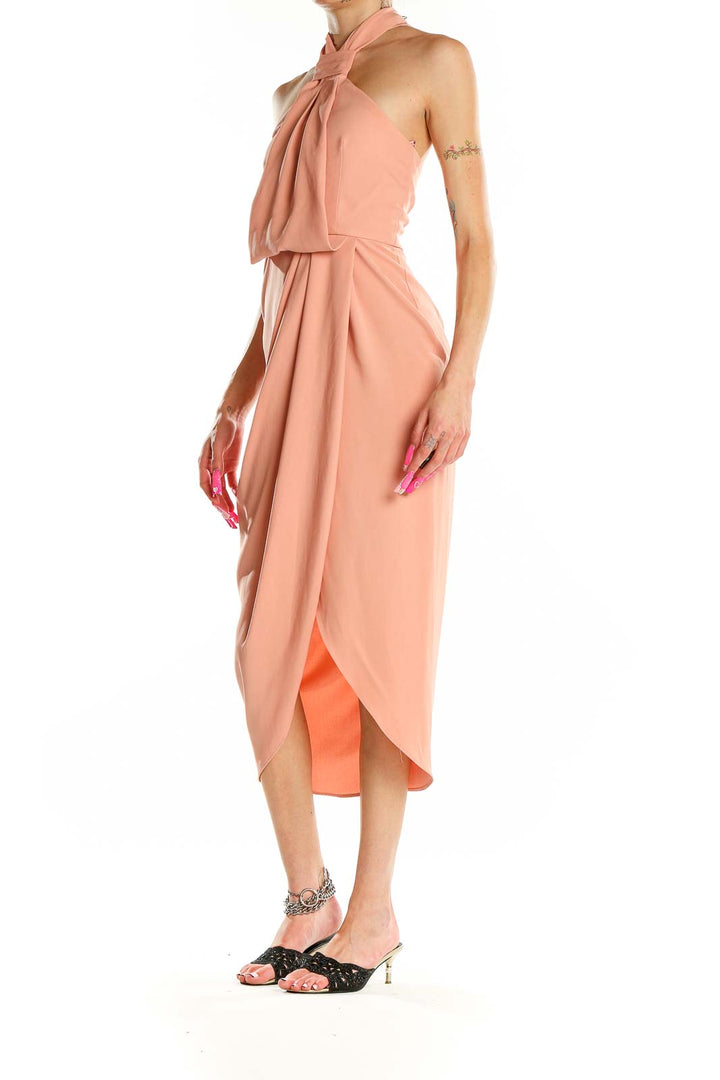 Elevate your style with this stunning peach midi dress from Shona Joy. The elegant halter neck design creates a sophisticated silhouette, perfect for both daytime events and evening soirées. Crafted from high-quality polyester, this dress offers a luxurious feel and excellent drape. The wrap-style skirt adds a touch of allure with its subtle high-low hemline, while the gathered waist accentuates your figure beautifully. In excellent condition, this XS-sized dress features flattering measurements to ensure a perfect fit. The soft peach hue is versatile and flattering, making it an ideal choice for various occasions. Complete your look with statement accessories and sleek heels for a truly head-turning ensemble.