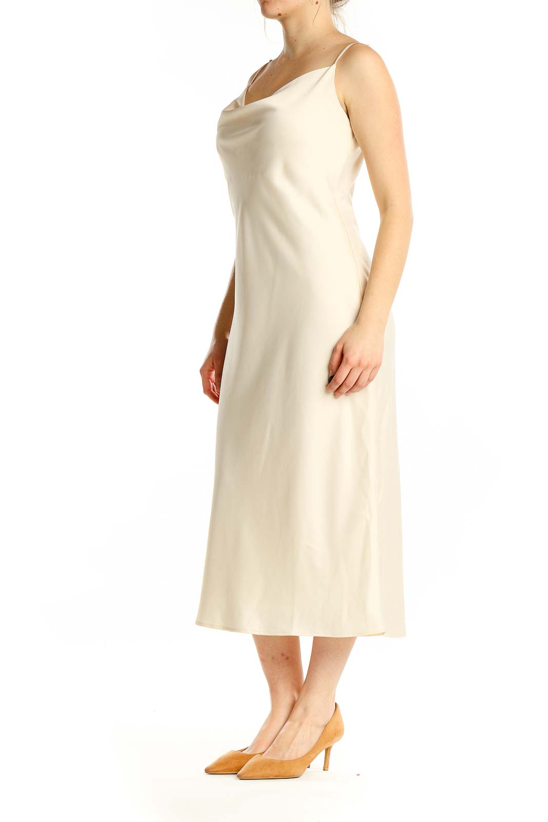 The midi length offers versatility, making it suitable for both formal events and more casual gatherings. The dress's smooth, satin-like texture catches the light beautifully, adding a subtle sheen that enhances its overall appeal. With its figure-skimming cut and soft cream hue, this piece is both timeless and on-trend.
