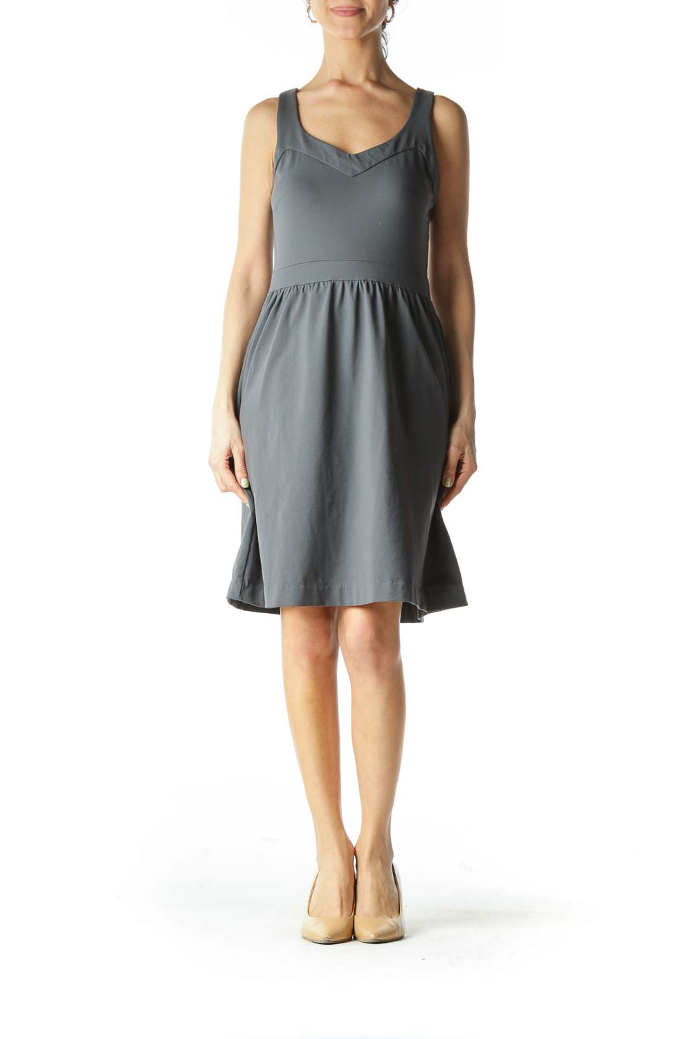 Gray Banded-Neckline Sheath-Waist Day Dress