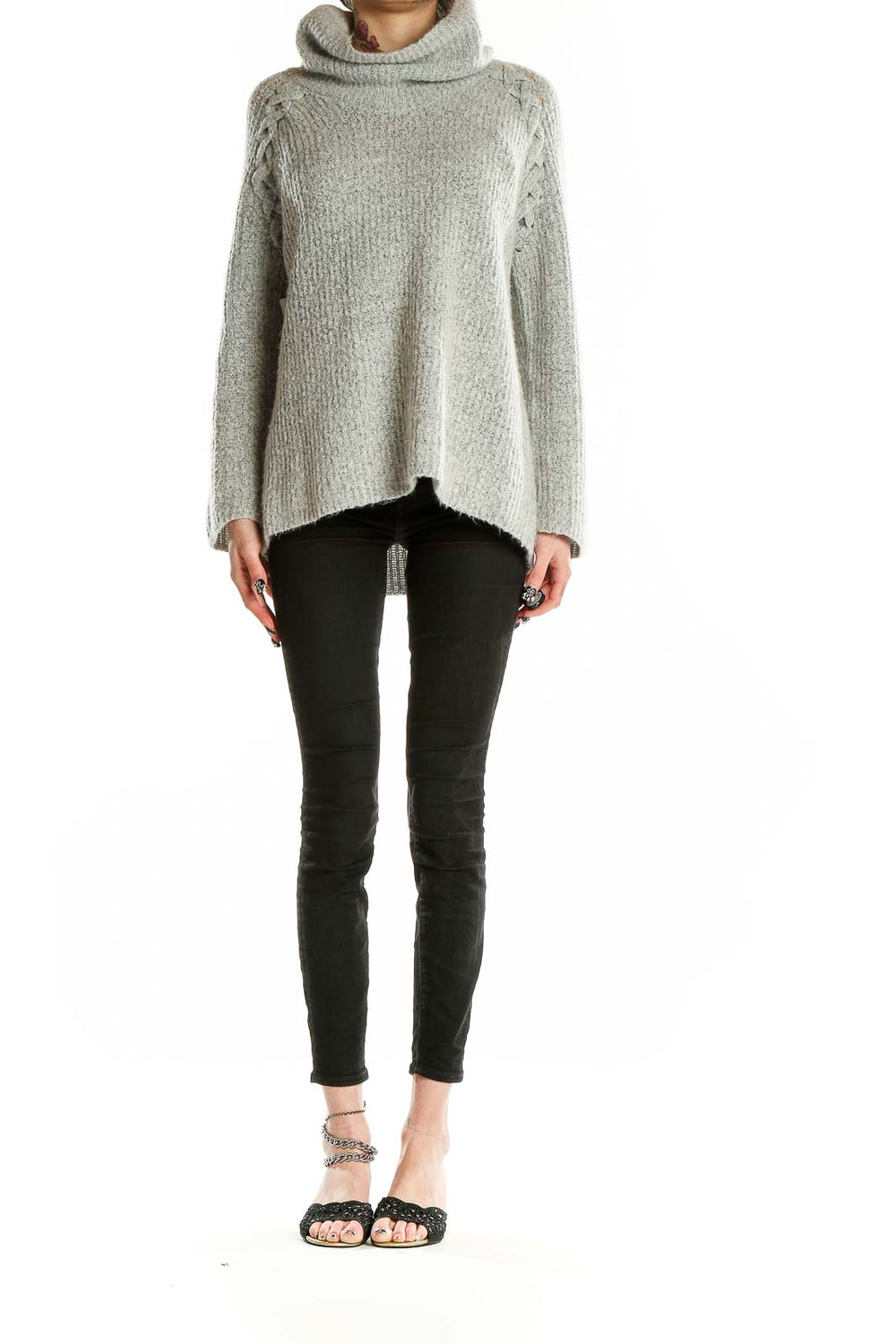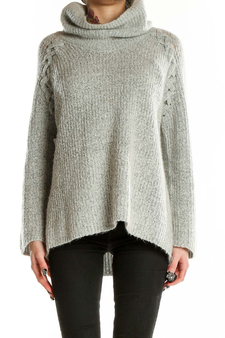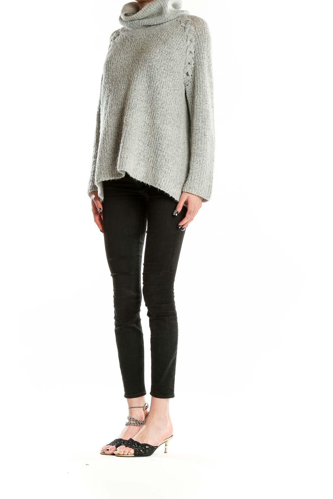 Front view of gray cowl neck sweater with lace-up shoulder details