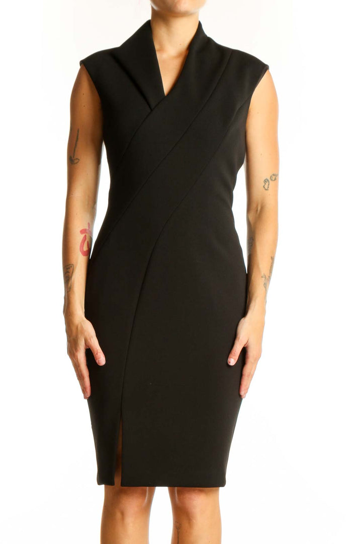 Elevate your wardrobe with this sophisticated black sleeveless wrap dress from Ted Baker London. Crafted from a luxurious blend of polyester and elastane, this dress offers both comfort and style. The wrap-style front creates a flattering V-neckline and a subtle slit, adding a touch of allure to this classic silhouette. The dress features a fitted bodice that accentuates your curves, while the knee-length cut keeps it versatile for various occasions. Perfect for both office wear and evening events, this dress exudes elegance with its clean lines and timeless design. In excellent condition, this Ted Baker London piece is a testament to quality craftsmanship and enduring style.