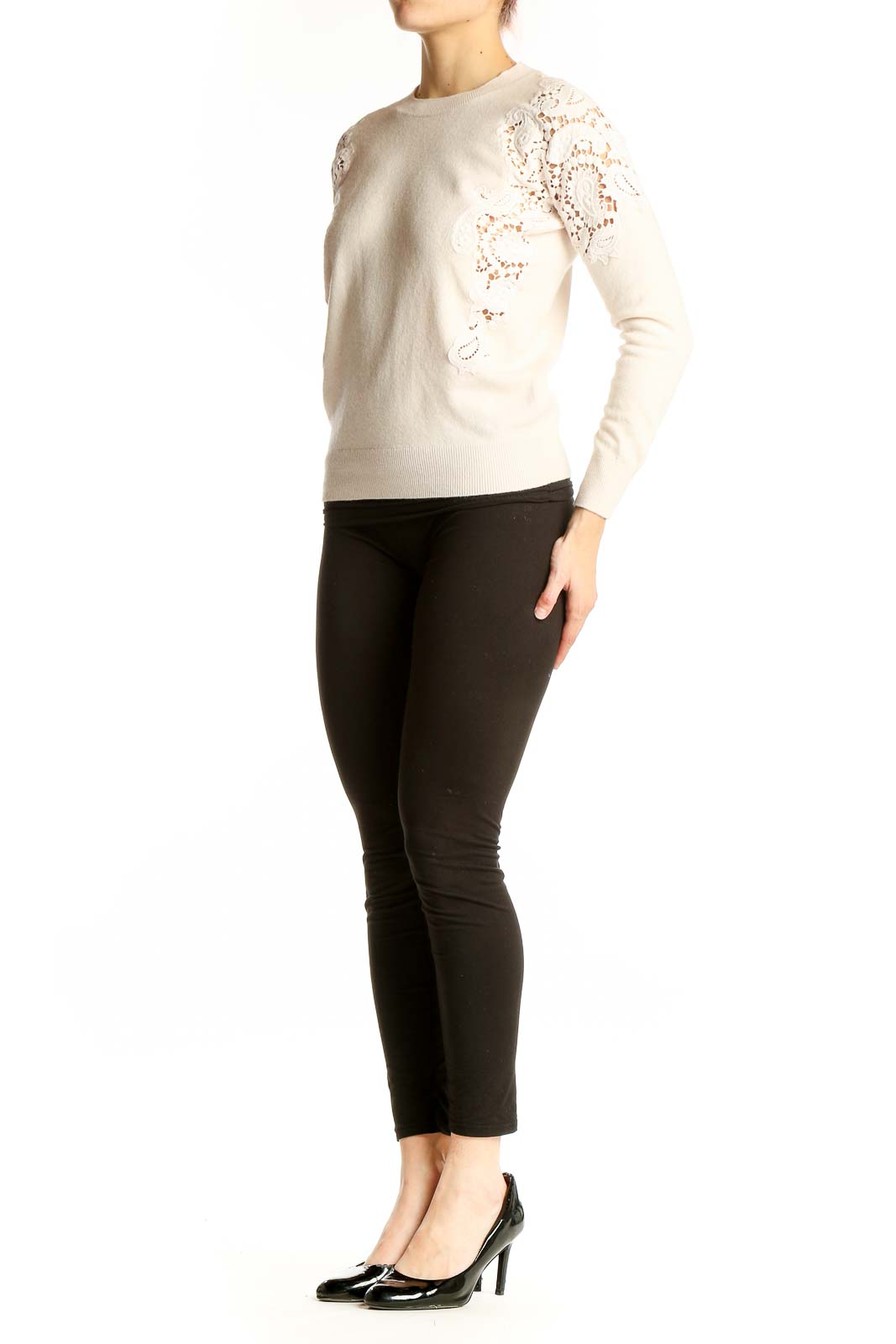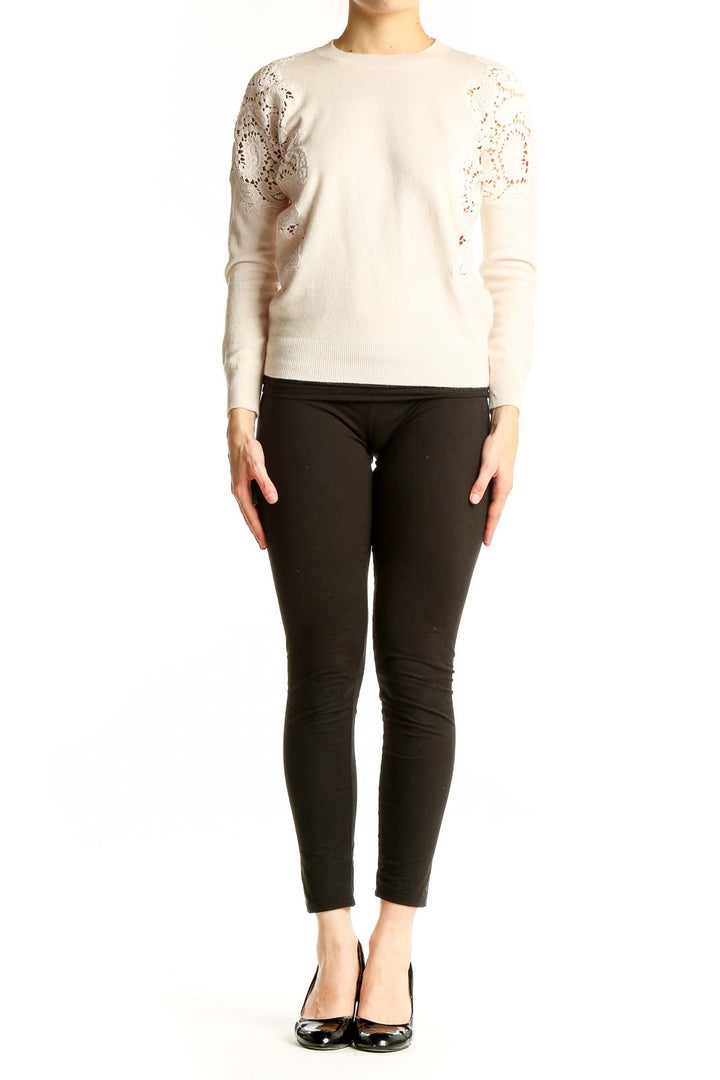 Front view of Ted Baker London cream sweater with lace detailing on shoulders