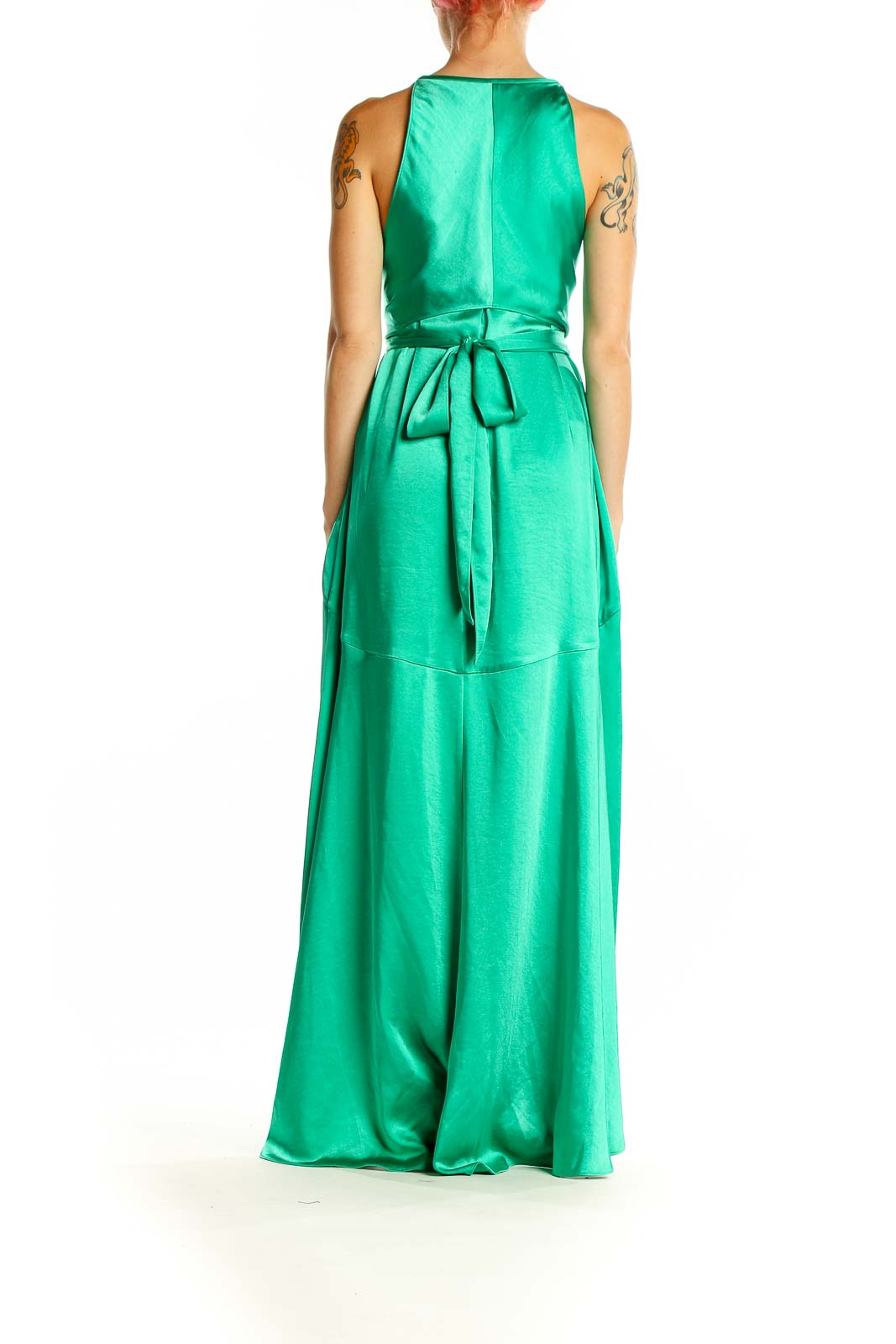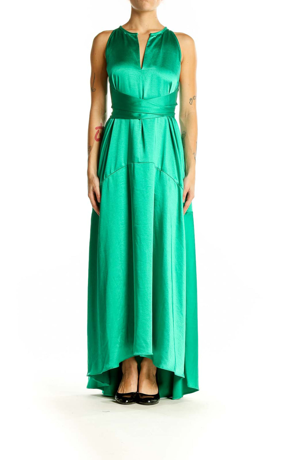 Make a stunning entrance in this vibrant green satin maxi dress from Ted Baker London. The sleek, floor-length silhouette features a flattering V-neckline and a cinched waist with a wide sash that ties elegantly at the back. The flowing A-line skirt cascades beautifully, creating a graceful movement with every step. Crafted from lustrous polyester, this dress offers a luxurious sheen that catches the light beautifully. The sleeveless design and high-low hemline add a modern touch to this classic evening gown. In good condition, this dress is perfect for formal events, galas, or any occasion where you want to make a lasting impression.