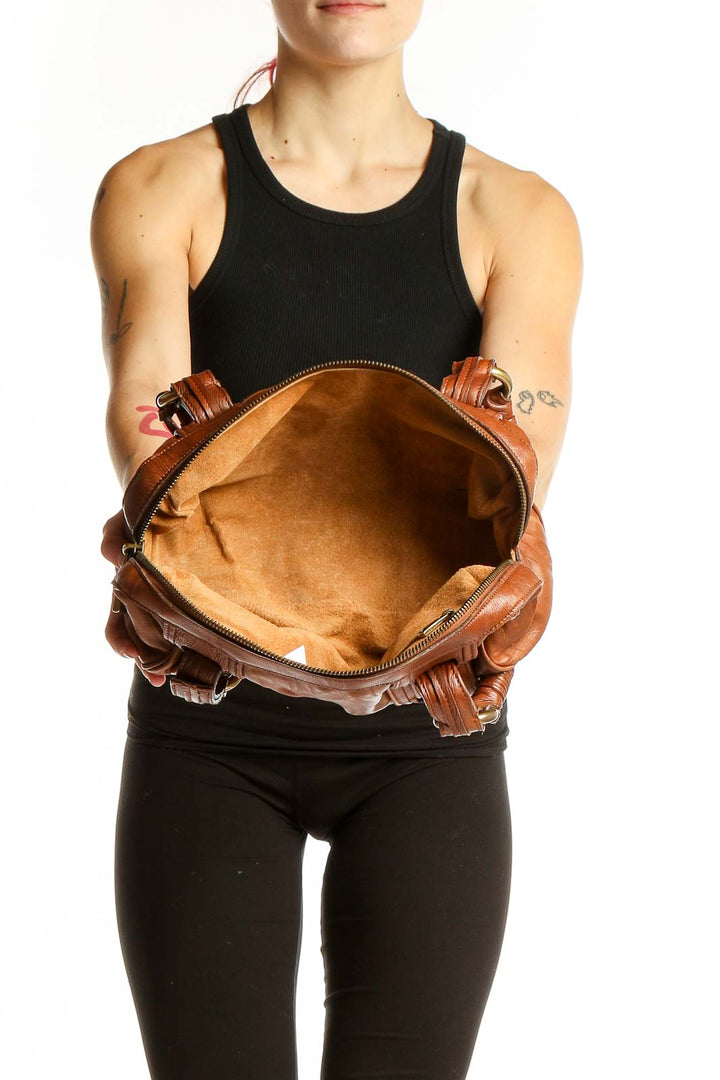 Open view of MARC JACOBS brown leather shoulder bag showing tan interior