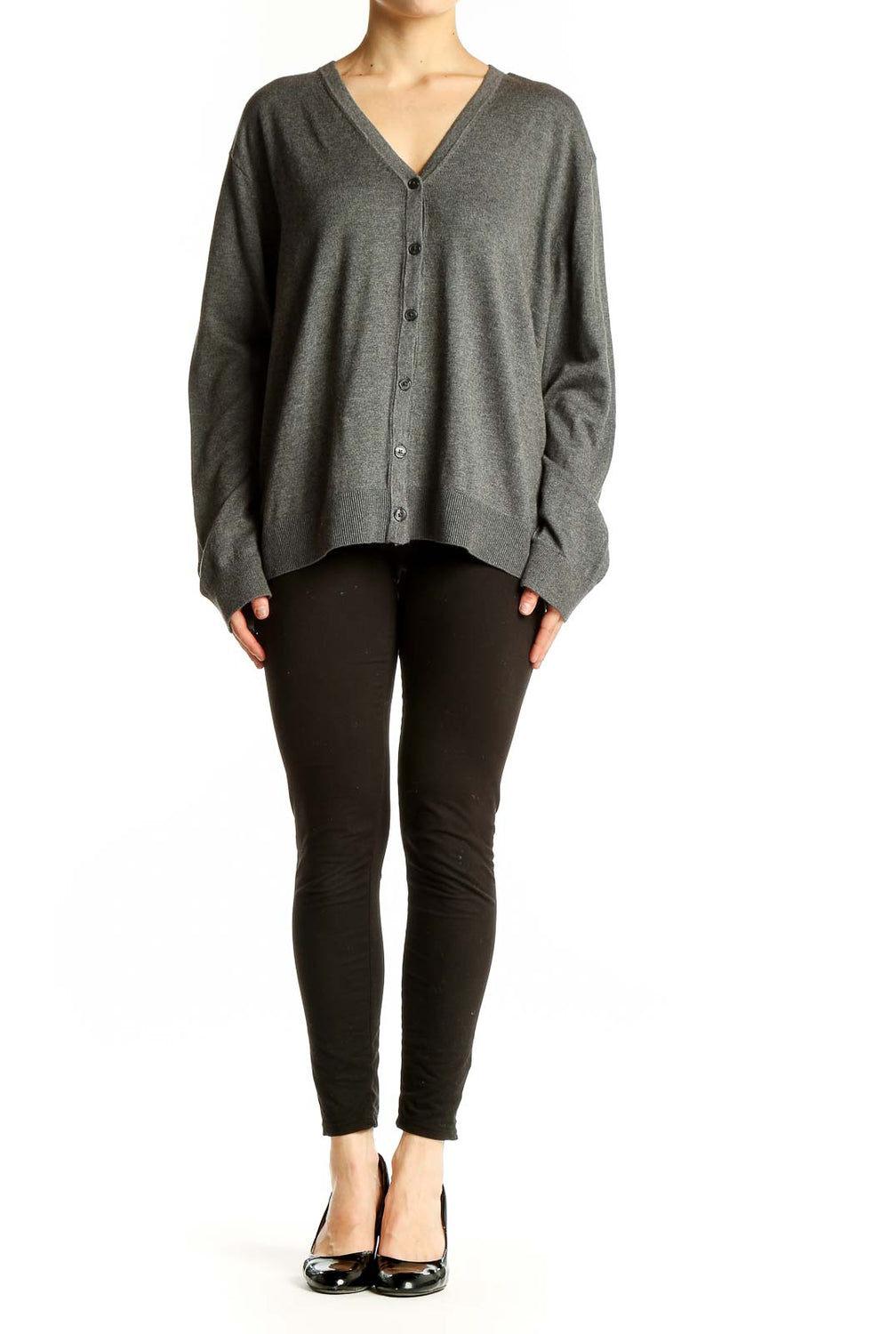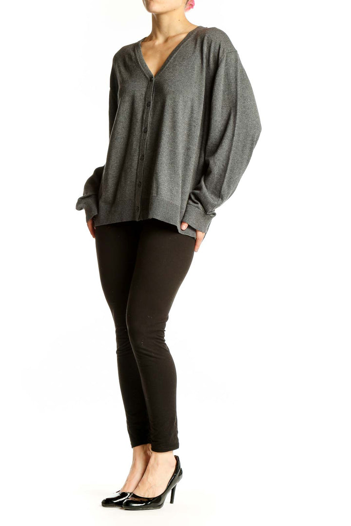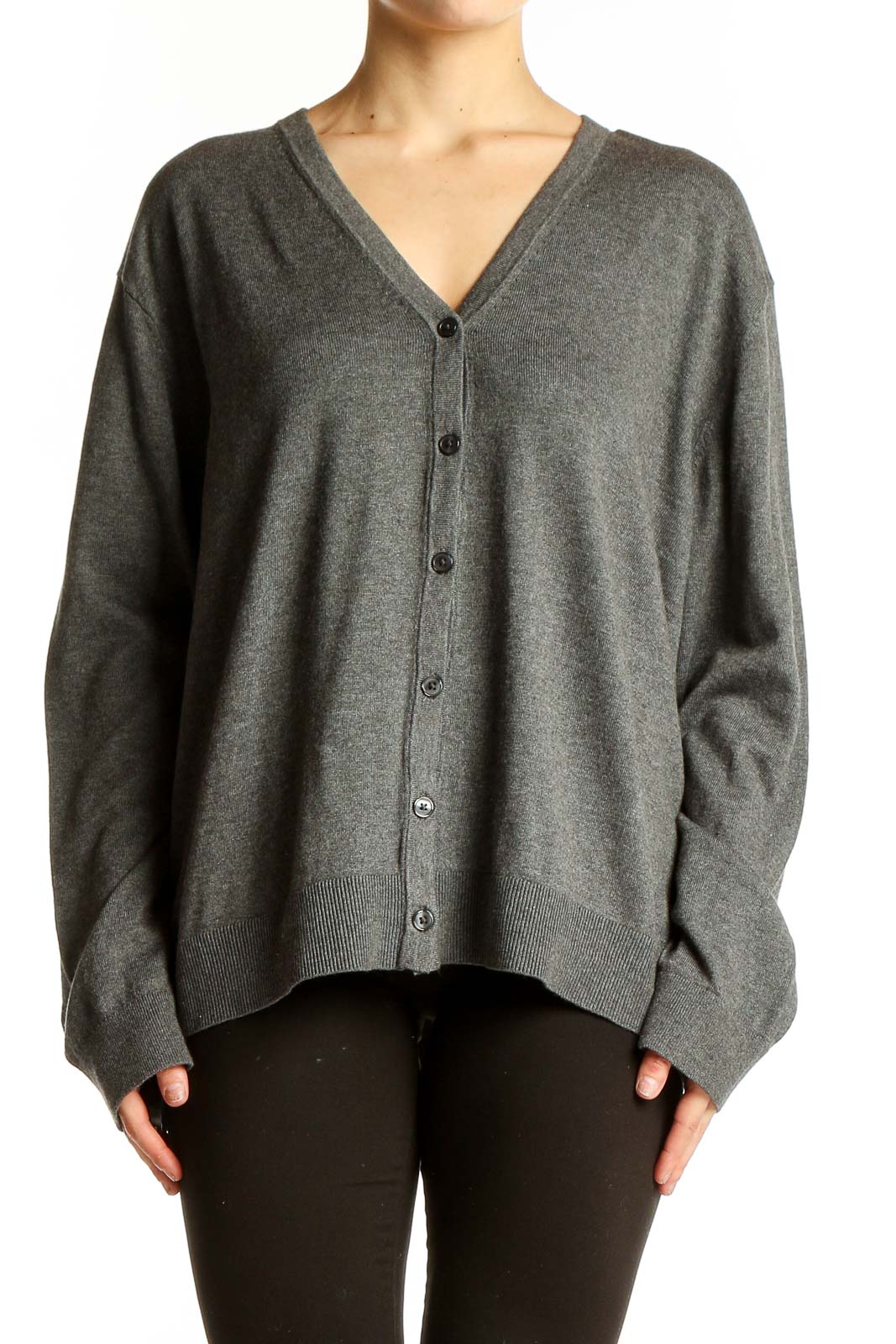 Elevate your casual wardrobe with this sophisticated gray V-neck cardigan from Banana Republic. Crafted from a luxurious blend of cotton, rayon, and viscose, this oversized sweater offers both comfort and style. The relaxed fit and dropped shoulders create a effortlessly chic silhouette, perfect for layering over your favorite tops.