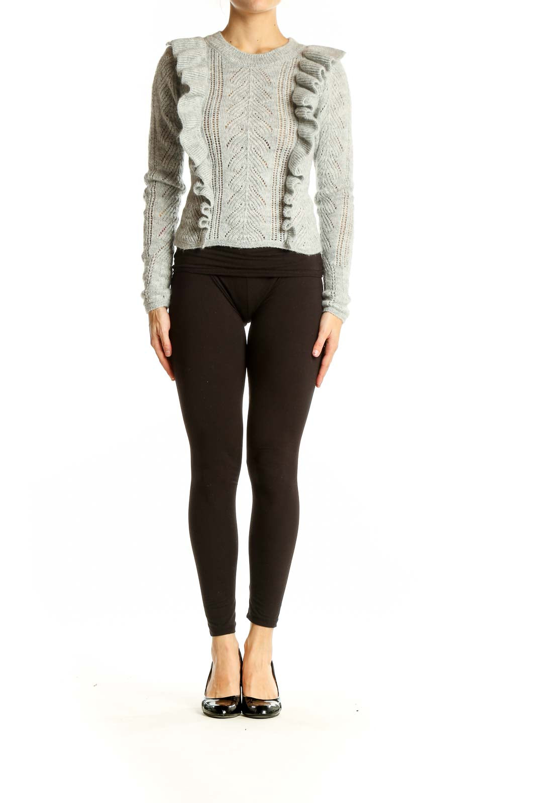 Elevate your knitwear collection with this charming gray ruffled sweater from Topshop. Crafted from a cozy blend of acrylic and polyester, this XS-sized piece offers both comfort and style. The sweater features an intricate pointelle knit pattern, creating a delicate and feminine look. Vertical ruffles along the front add a playful and trendy touch, perfect for adding dimension to your outfit. The crew neckline and long sleeves provide classic styling, while the cropped length gives it a modern edge. In excellent condition, this versatile piece can be dressed up or down for various occasions. With its soft texture and eye-catching design, this Topshop sweater is sure to become a favorite in your wardrobe.