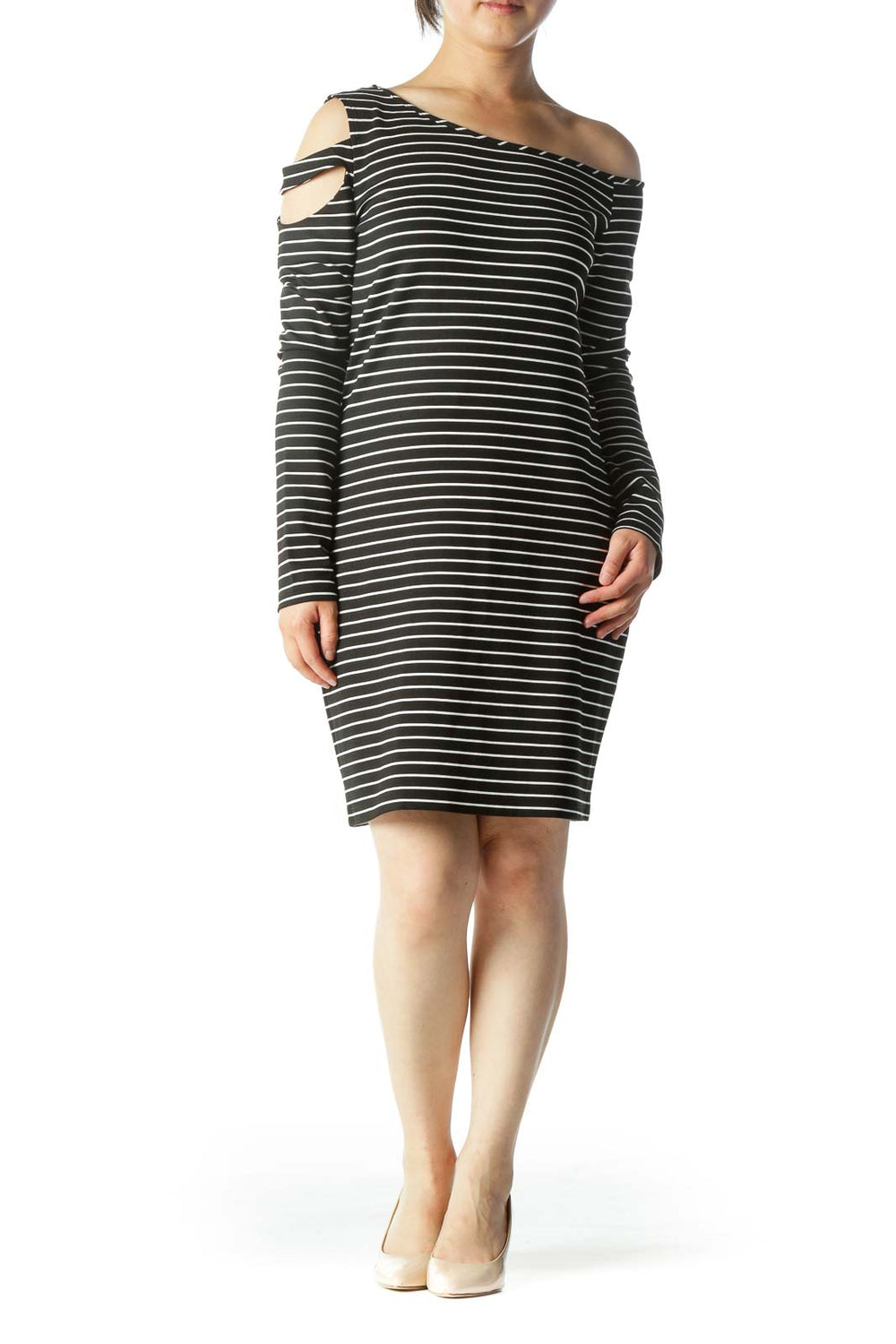 Black & White Striped Long-Sleeve Off-Shoulder Cut-Out Knit Dress
