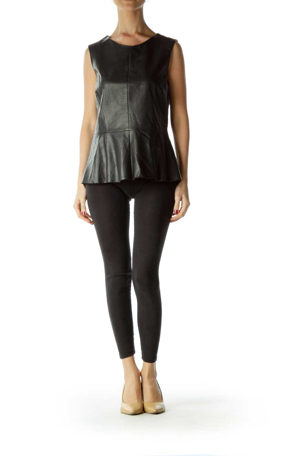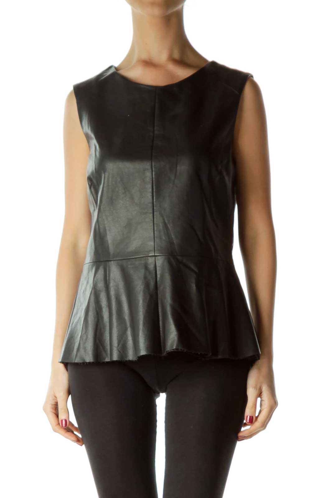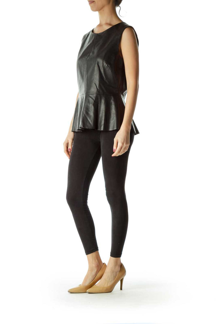 Black Peplum Faux Leather Round Neck Blouse