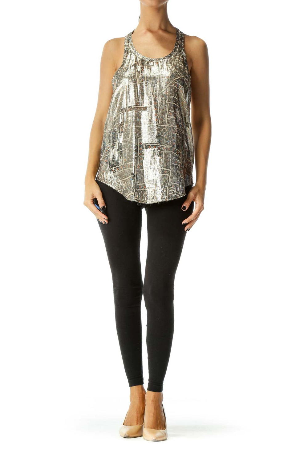 Gold Gray Orange Silk Blend Print Textured Studs Raw Hem Tank Top