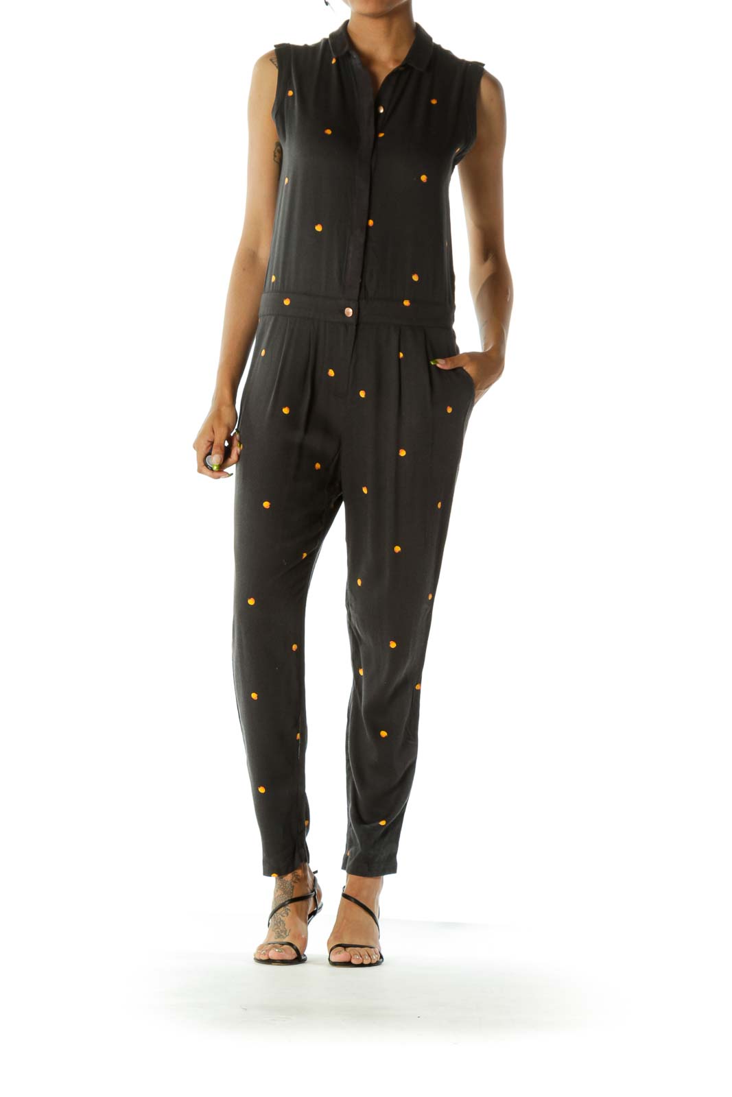 Faded Black Orange Peach Print Metallic Buttons Jumpsuit
