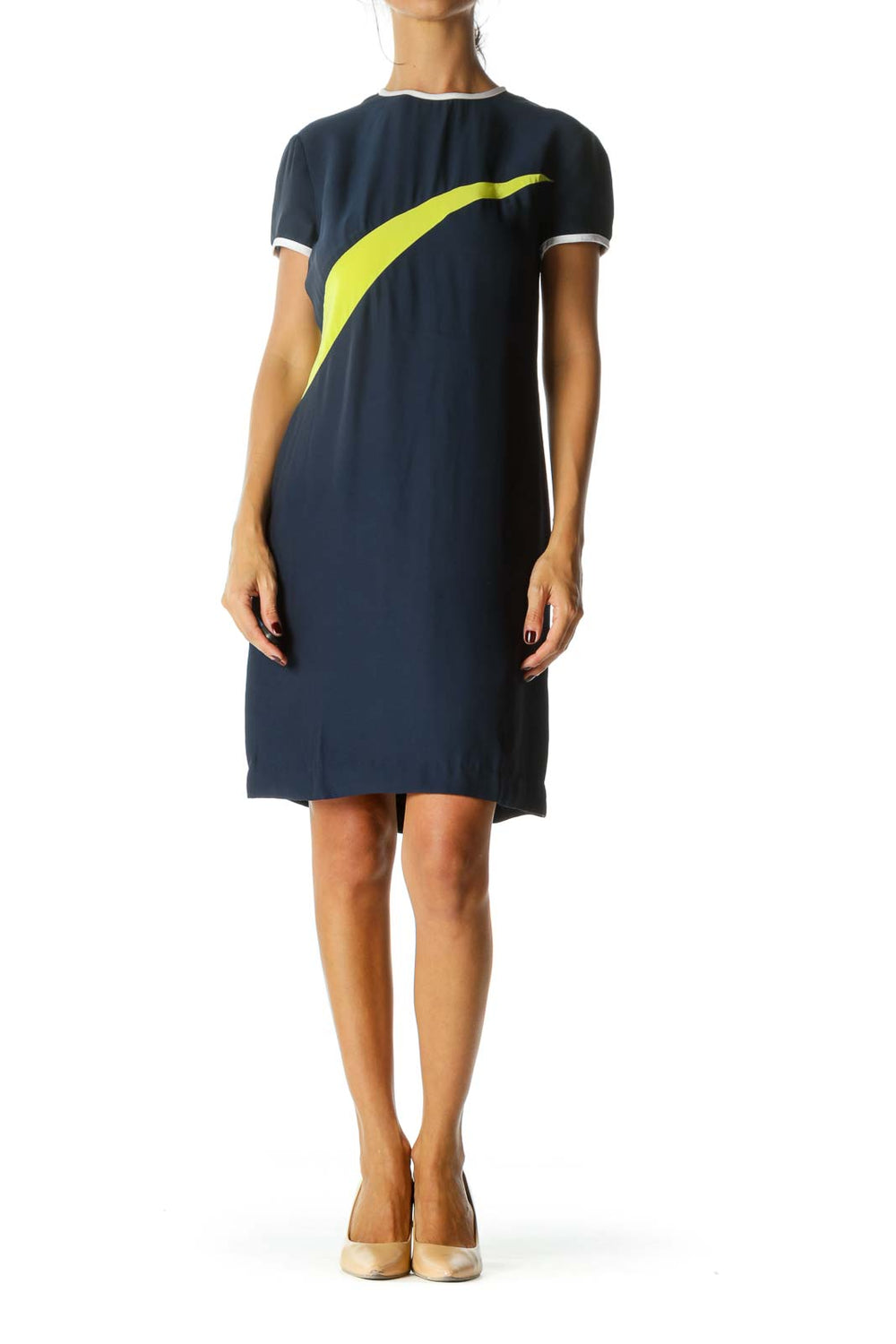 Navy Blue Fluorescent Green White Trim Short Sleeve Silk Blend Color Block Dress
