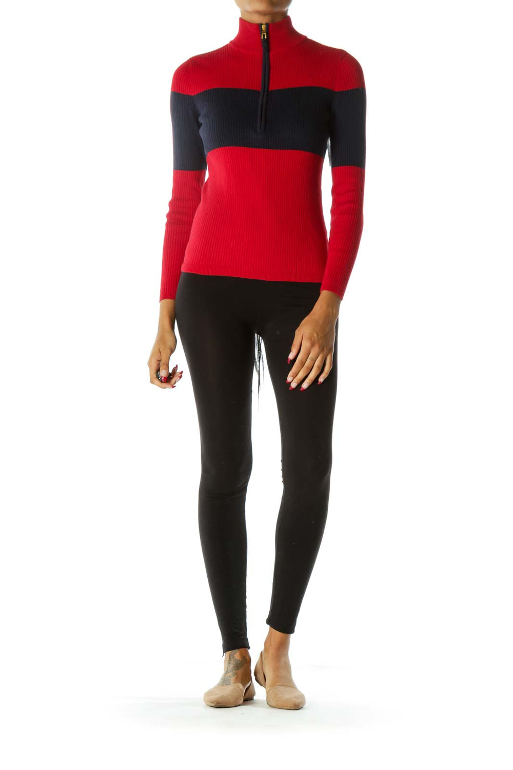 Blue Red 100% Cotton Zipper Long Sleeve Pull On Stretch Sweater